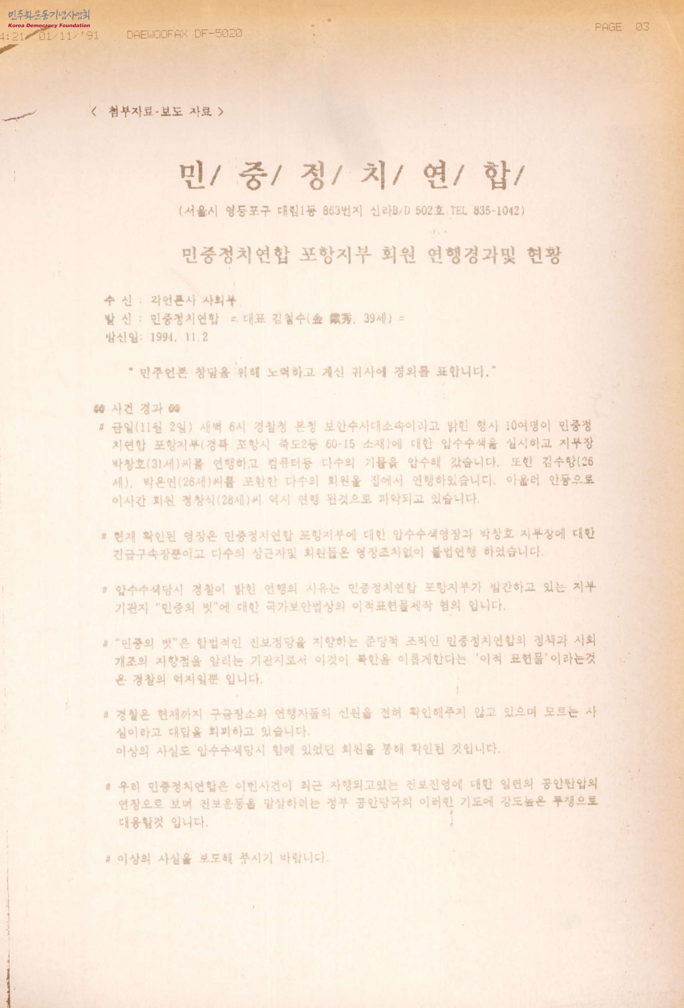 - 경찰청 본청 보안수사대 형사 10여 명이 민중정치연합 포항지부에 대한 압수색 및 연행에 대한 경과 및 현황 문서로, 지난 여름 원주지부 침탈로부터 시작된 사노맹을 빌미로 한 민정련 탄압의 일환으로 파악되며 다수의 회원을 연계하여 포장지역 사노맹건으로 몰아갈 가능성이 농후하다고 함