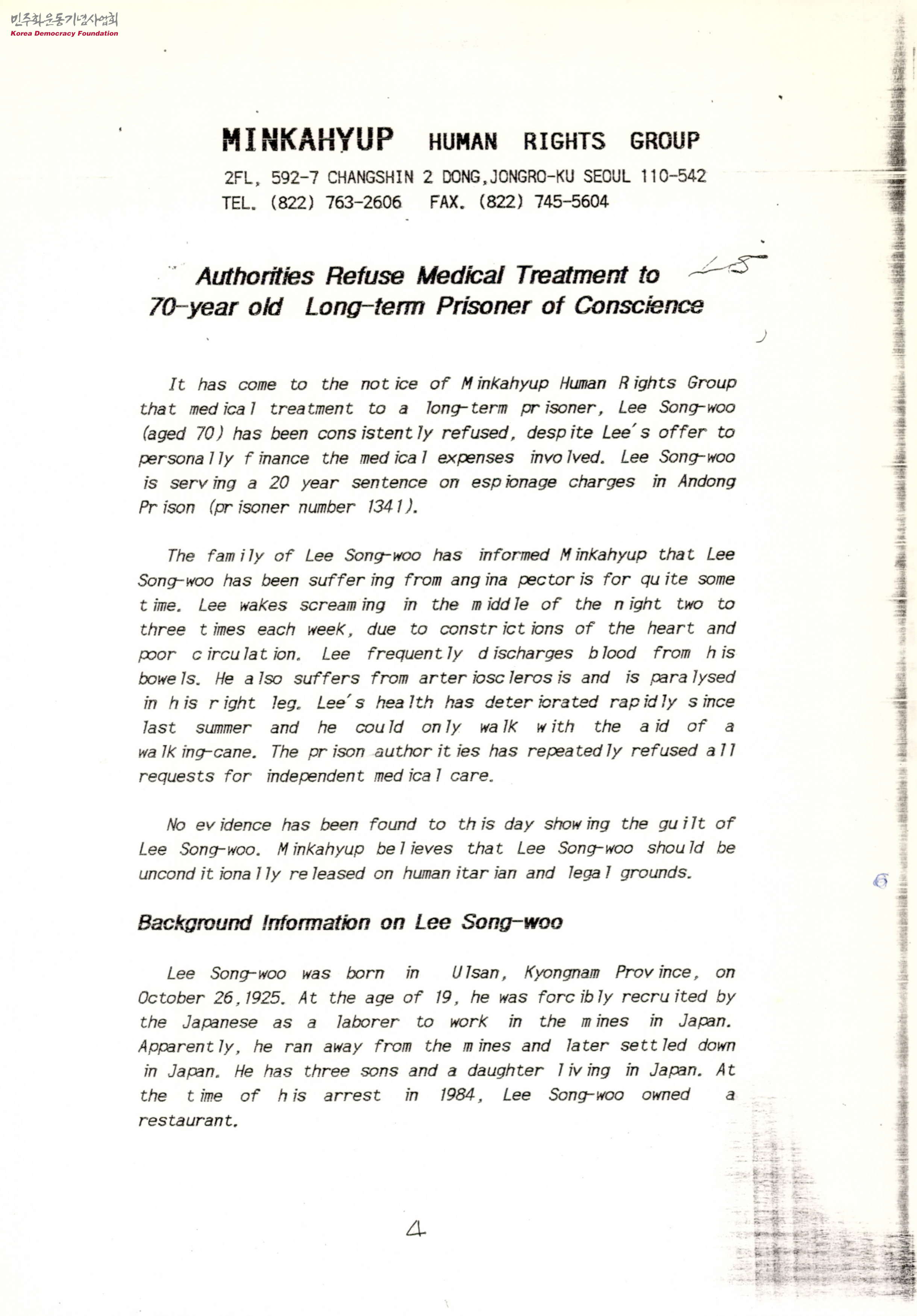 - 군사기밀 수집 및 유출의 혐의로 기소되어 국가보안법에 따라 실형을 선고받은 이성우씨에 대한 정보가 담긴 영문서로, 민가협은 그에 대한 배경정보를 제공함과 동시에 인도주의적, 법적 근거에 따라 무조건 석방되어야 한다고 밝힘