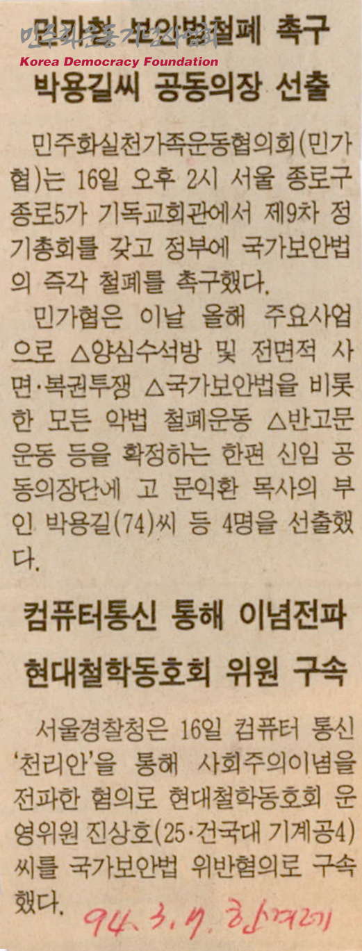 - 민주화실천가족운동협의회 제9차 정기총회에서 신임 공동의장단에 고 문익환 목사의 부인 박용길씨 등 4명을 선출하는 한편, 서울경찰청에서 컴퓨터 통신 '천리안'을 통해 사회주의 이념을 전파한 혐의로 현대철학동호회 운영위원 진상호씨를 국가보안법 위반 혐의로 구속했다는 내용을 담은 신문스크랩