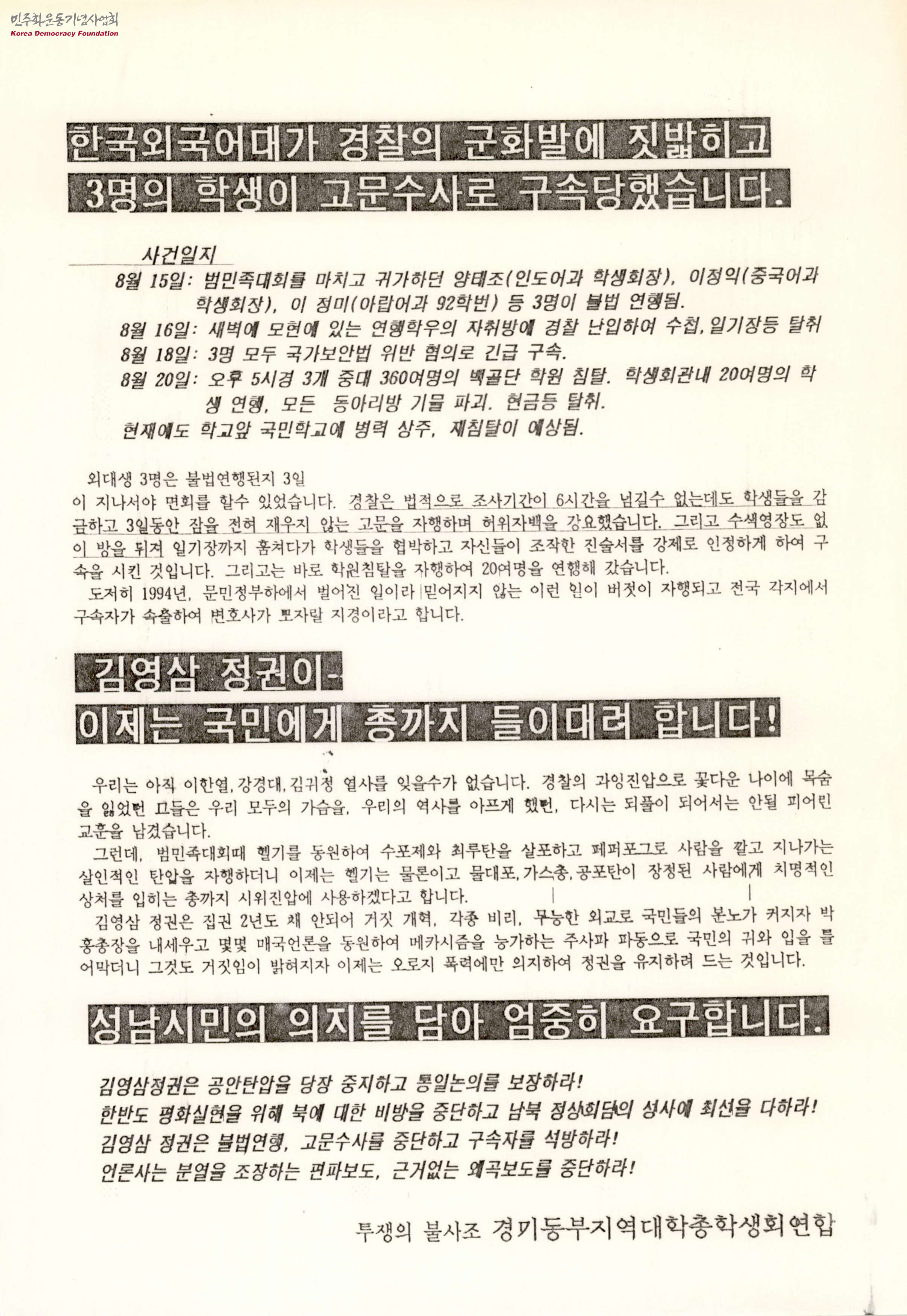 - 범민족대회를 마치고 귀가하던 외대생 3명이 국가보안법 위반 혐의로 구속된 사건에 대해 현 정권을 비판하며 구속자들의 석방을 요구하는 내용의 문서