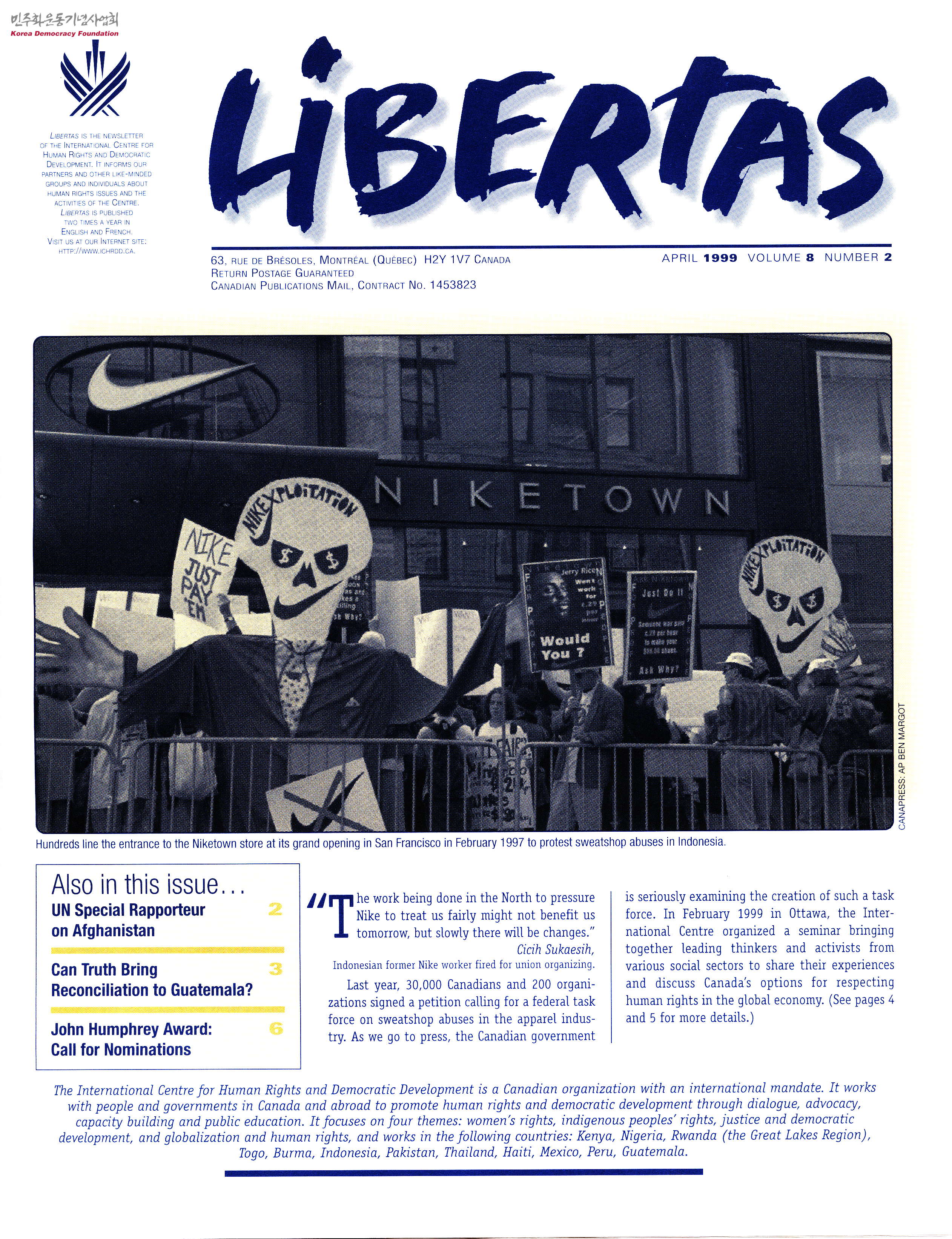 - International Centre for Human Rights and Democratic Development에서 발행한 기관지 'LiBERTAS' 1999년 4월 권2호로 목차는 다음과 같음 1. UB Special Rapproteur on Afghanistan(아프가니스탄 특별 보고관) 2. Can Truth Bring Reconciliation to Guatemala?(진실이 과테말라에 화해를 가져올 수 있을까? 3. John Humphrey Award: Call for Nominations(존 험프리 상: 후보자 추천 요청)