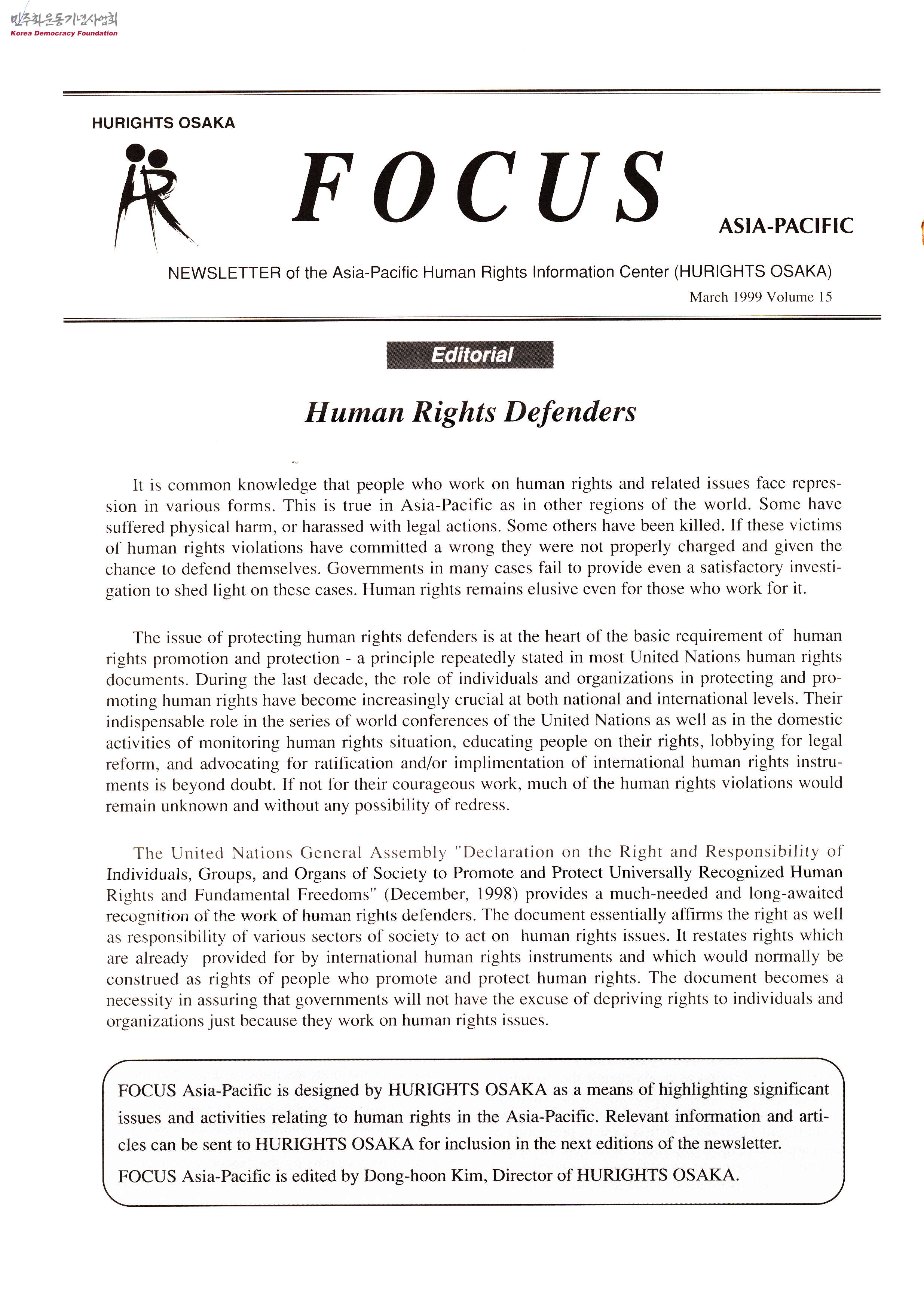 - HURIGHTS OSAKA에서 민가협 남규선씨에게 보낸 'FOCUS ASIA-PACIFIC' 1999년 3월 15권 정기간행물로, 목차는 다음과 같음 1. Editorial-Human Rights Defenders(편집자 글 - 인권 옹호자) 2. Best Practices for National Institutions for Human Rights : Common Action for NGOs and National Human Rights Institutions(인권을 위한 국가 기관의 모범 사례: NGO와 국가 인권 기관을 위한 공동 행동) 3. New Human Rights Centers for Asia-Pacific(아시아-태평양의 새로운 인권 센터) 4. General Agreement on Networking for Human Rights in the Asia-Pacific Region(아시아-태평양 지역의 인권 네트워킹에 관한 일반 협정) 5. Pune Conference-UNESCO'S Asia-Pacific Regional Meeting on Human Rights Education(푸네 회의 - 유네스코 아시아-태평양 지역 인권 교육 회의) 6. The Pune Declaration on "Education for Human Rights in Asia & the Pacific"(푸네 선언 - "아시아 및 태평양의 인권 교육") 7. From the Eyes of the Child(어린이의 시각에서) 8. The 2nd International Youth Camp(제2회 국제 청소년 캠프) 9. EVENTS(이벤트) 10. NEW PUBLICATIONS(새로운 출판물)