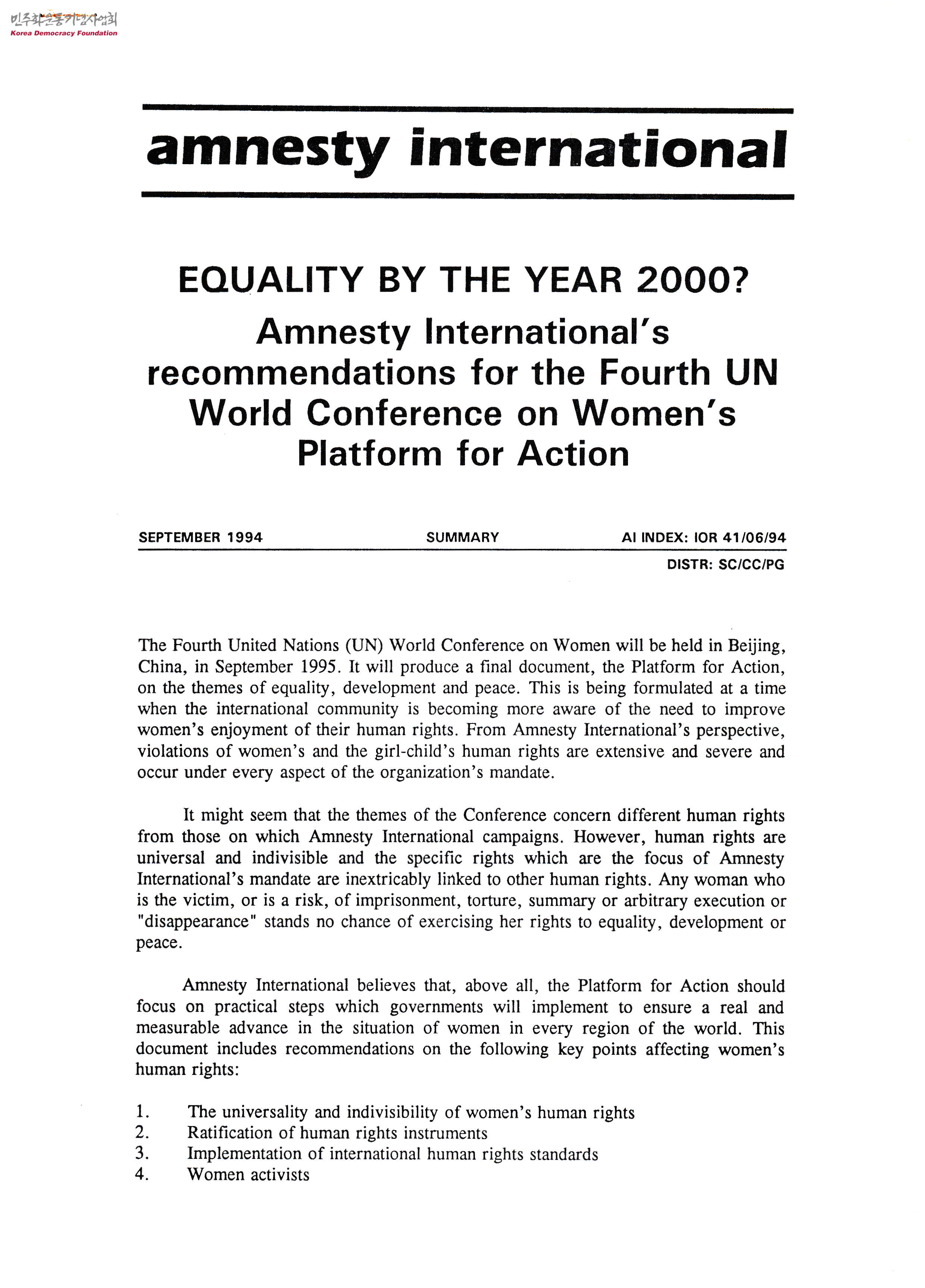 EQUALITY BY THE YEAR 2000? Amnesty International's recommendations for the fourth UN World Conference on Women's Platform For Action(2000년까지 평등? 국제엠네스티의 제4회 유엔 여성 행동 강령 세계 회의에 대한 권고사항)