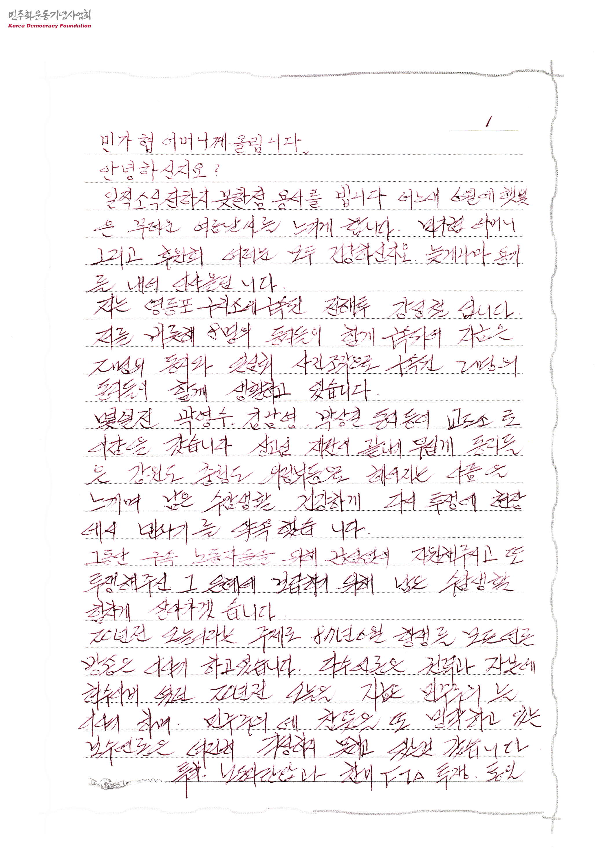 - 영등포구치소에 구속된 강성철이 민가협에게 보낸 편지로, 떠나가는 동지들을 보면서 마음이 아프지만, 민가협 가족분들의 지지에 힘입어 다른 마음을 품지않고 투쟁의 길을 이어가겠다는 의지가 담겨 있음