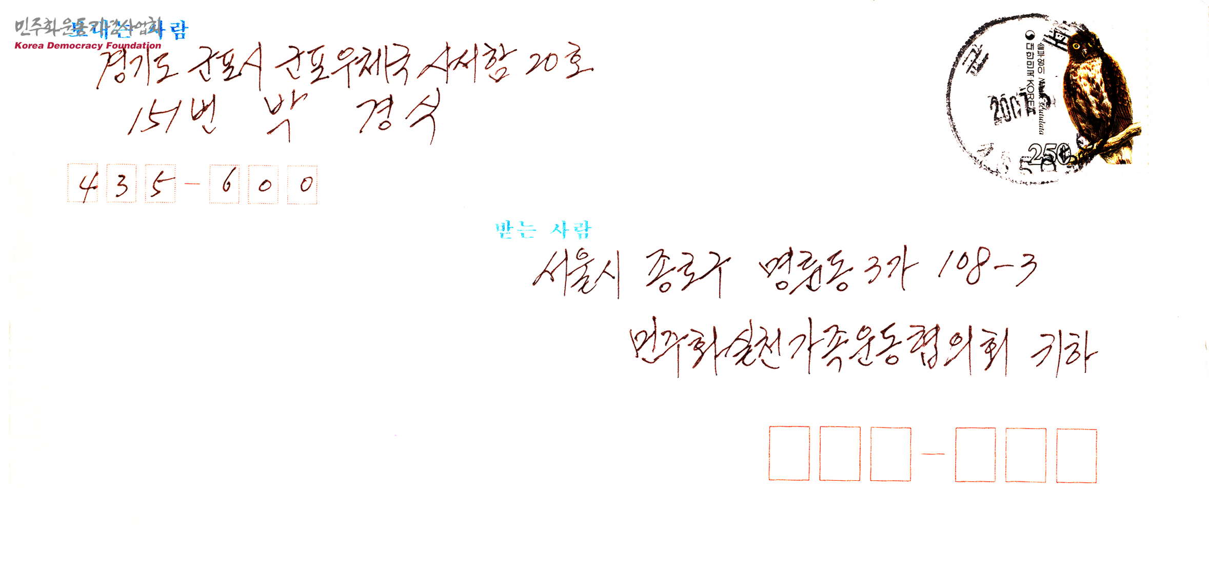 - 일심회 사건으로 체포된 박경식이 민가협 어머니들에게 보낸 편지로, 따뜻하게 손을 내밀어준 민가협에 대한 감사의 인사와 함께 현 시국에 대한 안타까움이 담겨 있음