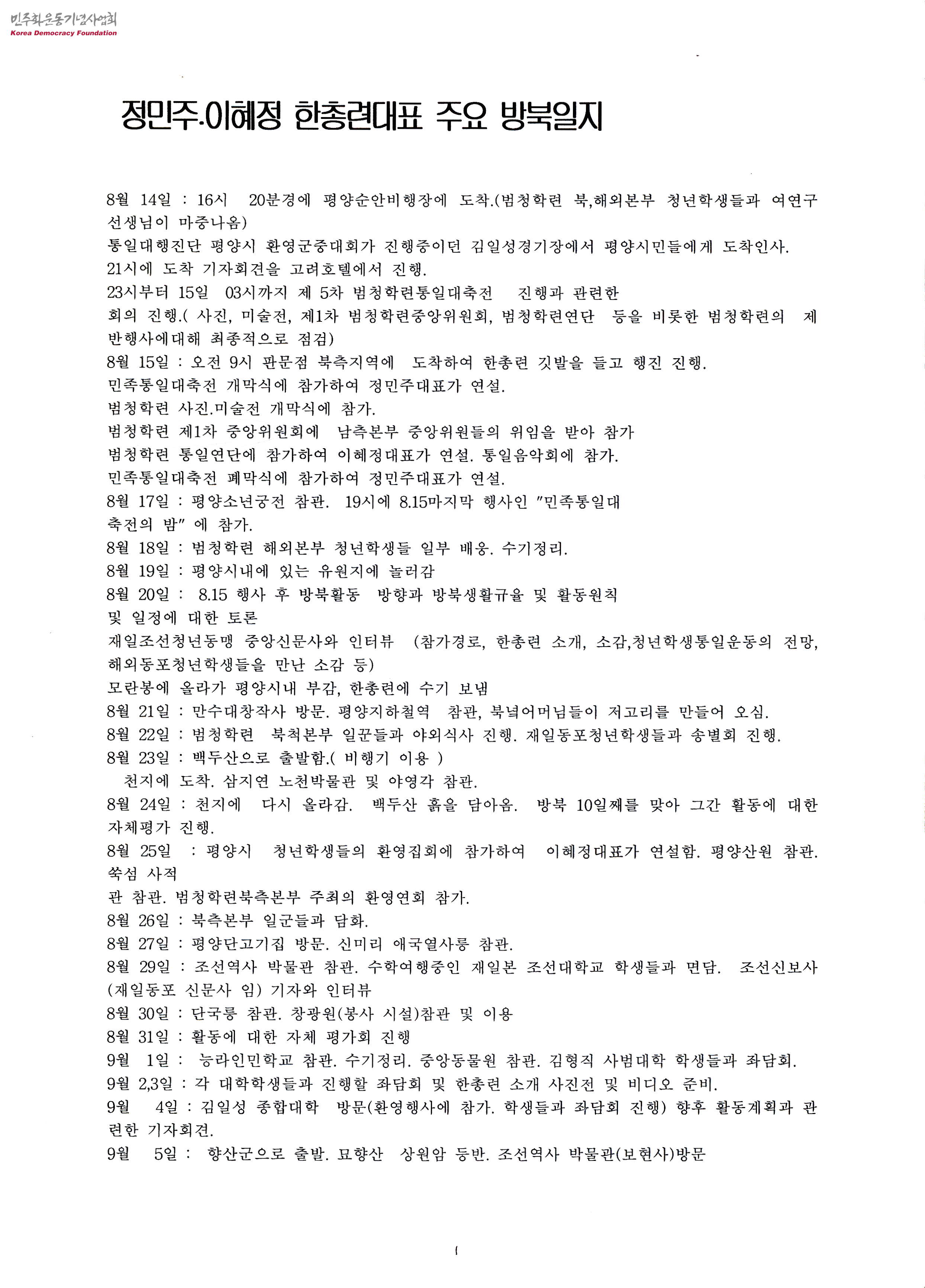 - 정민주, 이혜정 한총련대표의 주요 방북일지로 8월 14일부터 10월 3일까지 평양순안비행장을 도착하여 민족통일대축전의 밤에 참석하고 범청학련북측본부 주최의 환영연회를 참가하는 등의 활동을 하였으며 3일 환송집회에 참가하여 판문점에 남측으로 돌아왔고 이러한 정민주 이혜정 두 대표의 1차, 2차, 5차 공판의 내용이 담긴 문서