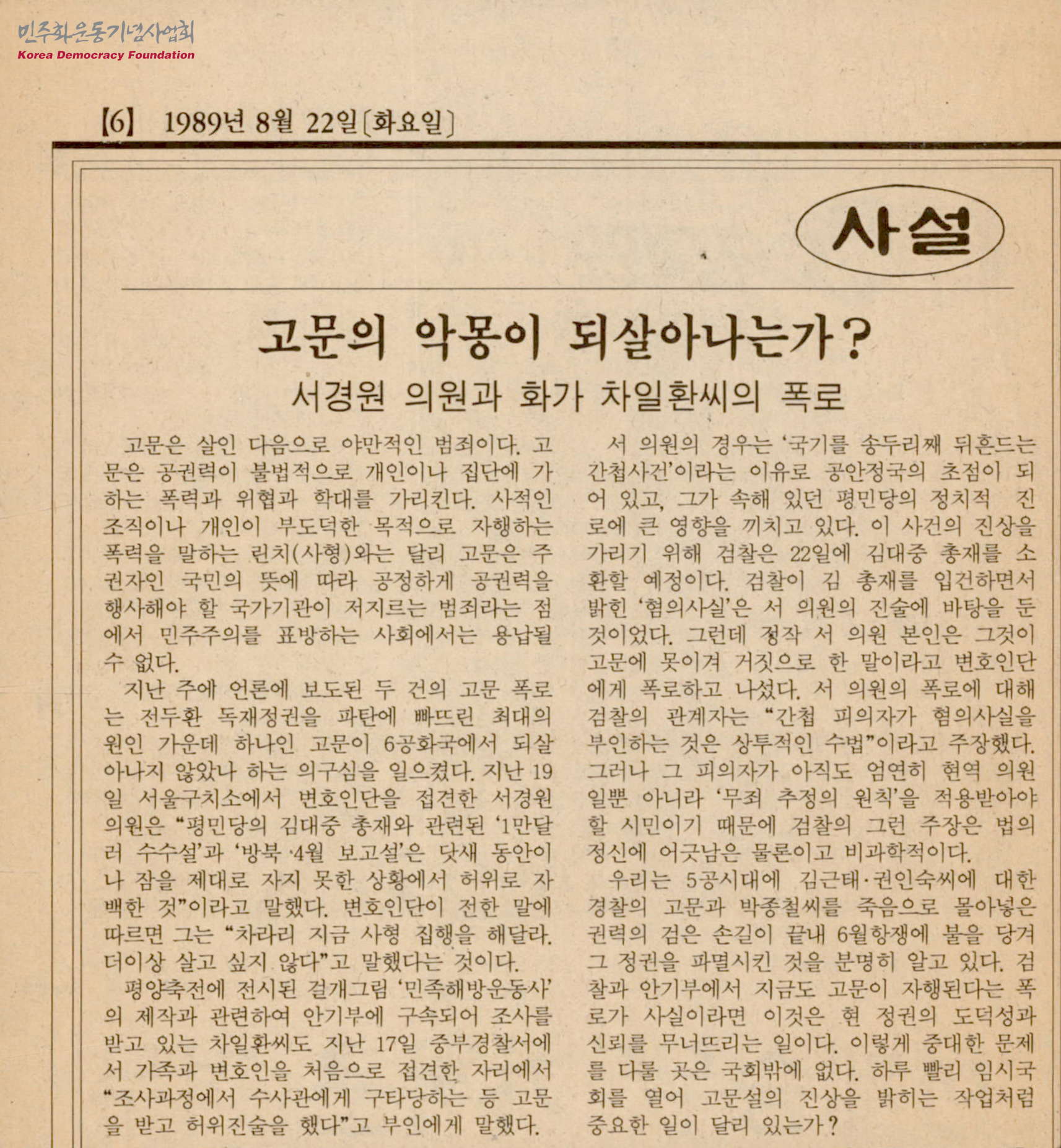 [신문스크랩]고문의 악몽이 되살아나는가?-서경원 의원과 화가 차일환씨의 폭로