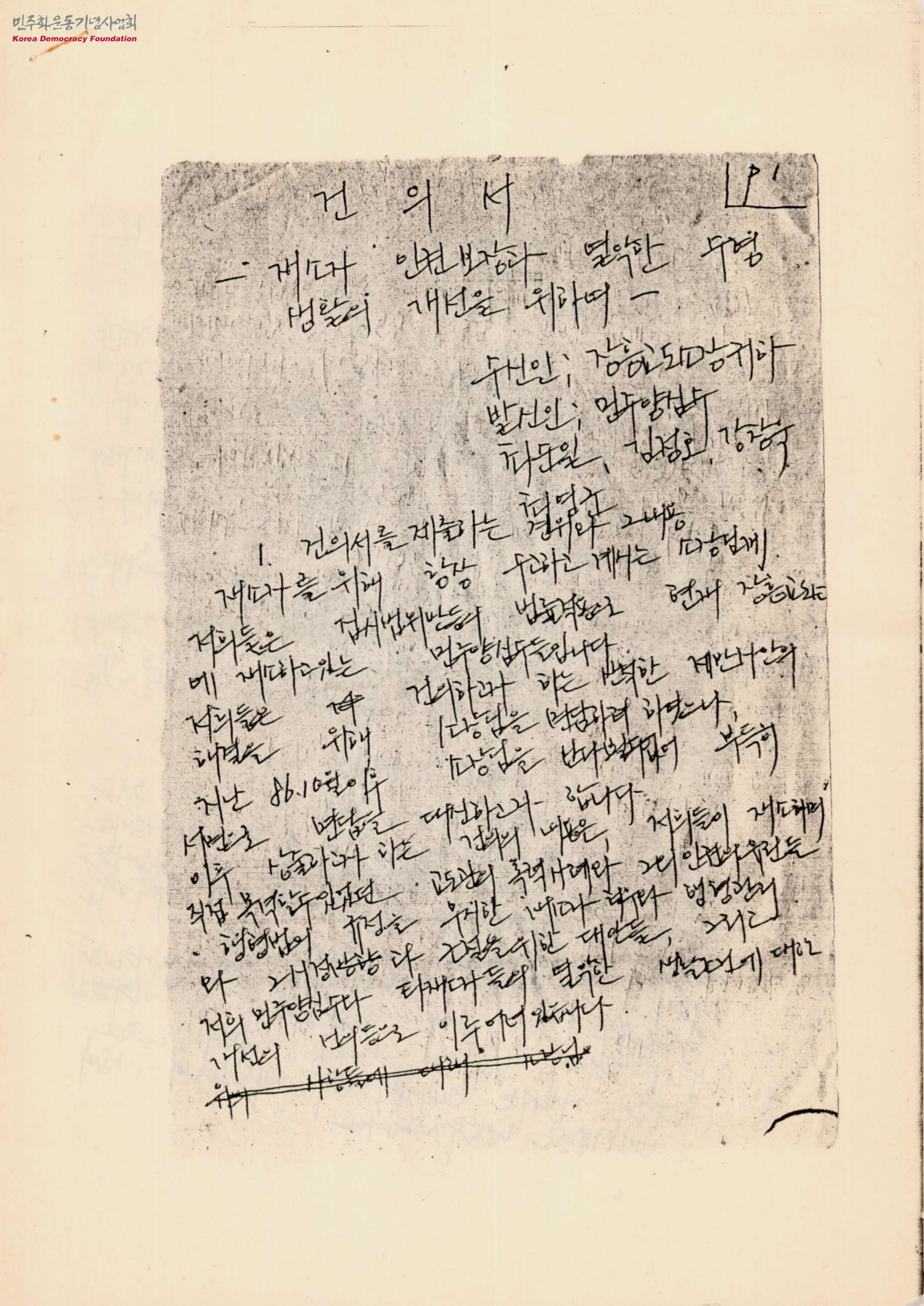 - 민주양심수 최순일· 김정호· 강창욱씨가 장흥교도소장에게 제출한 건의서로, 건의서를 제출하는 경위와 내용, 교도관에 의한 재소자 폭력사례와 인권유린, 행형법에 위반되는 행형사례 등의 내용과 더불어 재소자 생활조건 개선을 위한 건의사항이 담겨있음