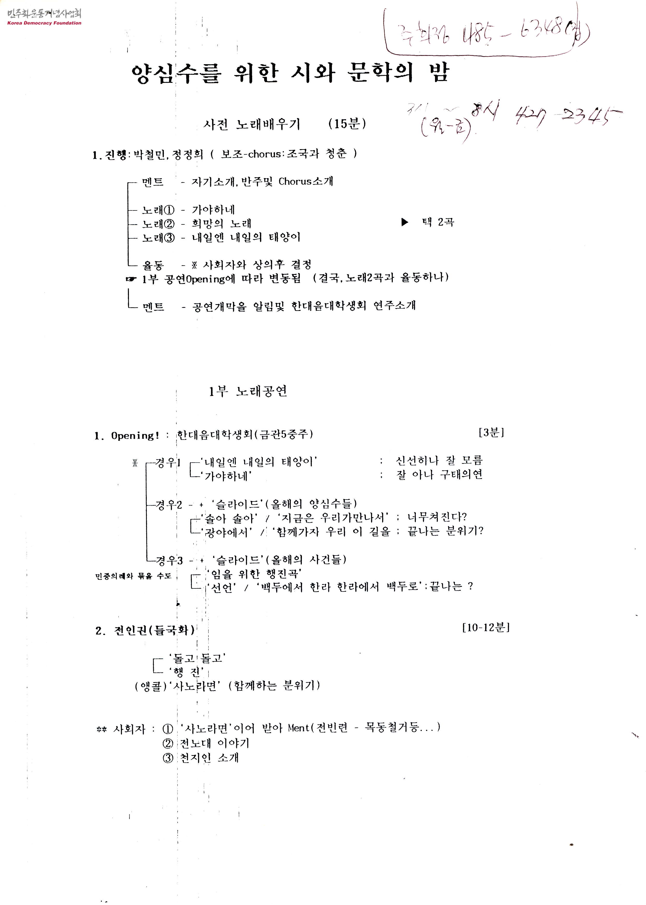 - 양심수를 위한 시와 문학의 밤 행사 일정표로, 행사의 순서와 출연진과 노래의 제목, 소요시간 등의 정보가 담겨 있음