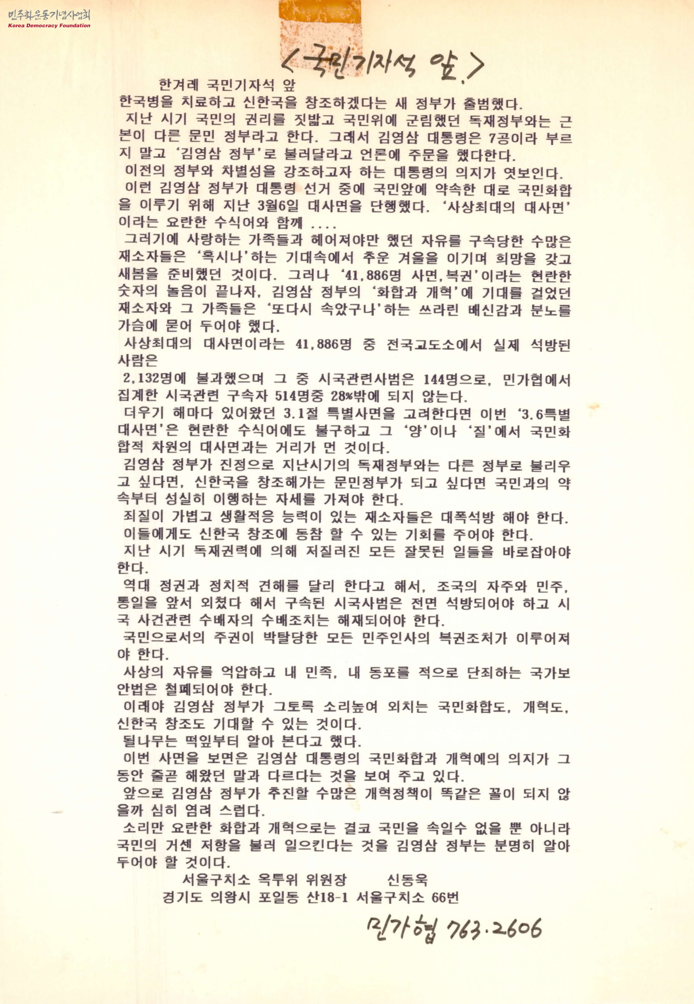 - 서울구치 옥투위 위원장 신동욱이 한겨레 국민기자석으로 보낸 자료로 1993년 김영삼 정부가 대사면을 단행하였지만 시국관련 구속자 중 낮은 비율의 사범들이 석방되었고 시국 사범들의 전면 석방과 시국 사건관련 수배자의 수배조치가 해재되어야 한다는 내용의 글