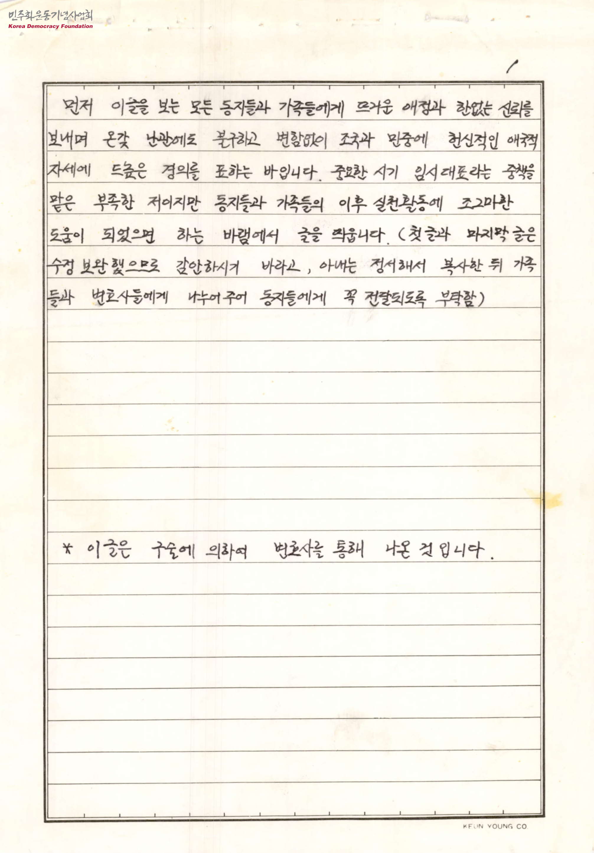 - 남한조선노동당'이라는 가상의 단체를 간첩단으로 만들어 애국전선이라는 단체를 조작하였고 이를 투쟁과 재판을 통해 이겨내겠다는 글로 투쟁의 의의와 방식, 재판, 조직의 구성, 가족대책위에 올리는 글 등이 담겨있는 편지