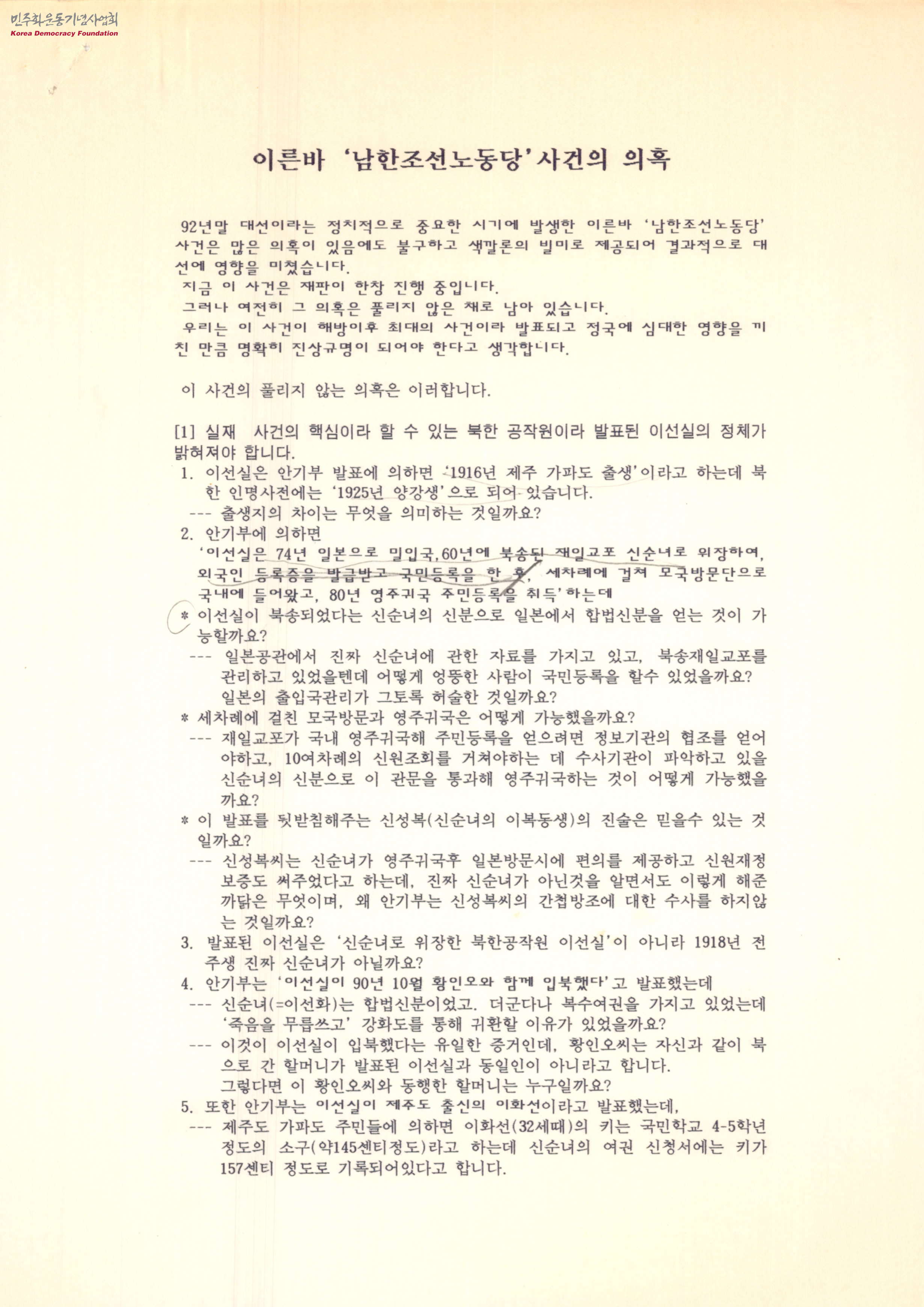 - 1992년 말 대선이란 시기에 발생한 '남한조선노동당'사건이 아직도 재판진행중이며 이에 대한 진상규명이 필요하다는 문서로 진상규명되어야 하는것 중에 북한 공작원이라 발표된 이선실의 정체, 김낙중 사건, 중부지역당 사건, 손병선 사건 등 간첩단 사건의 관계성, 사건의 확대화 등의 내용이 담겨있음