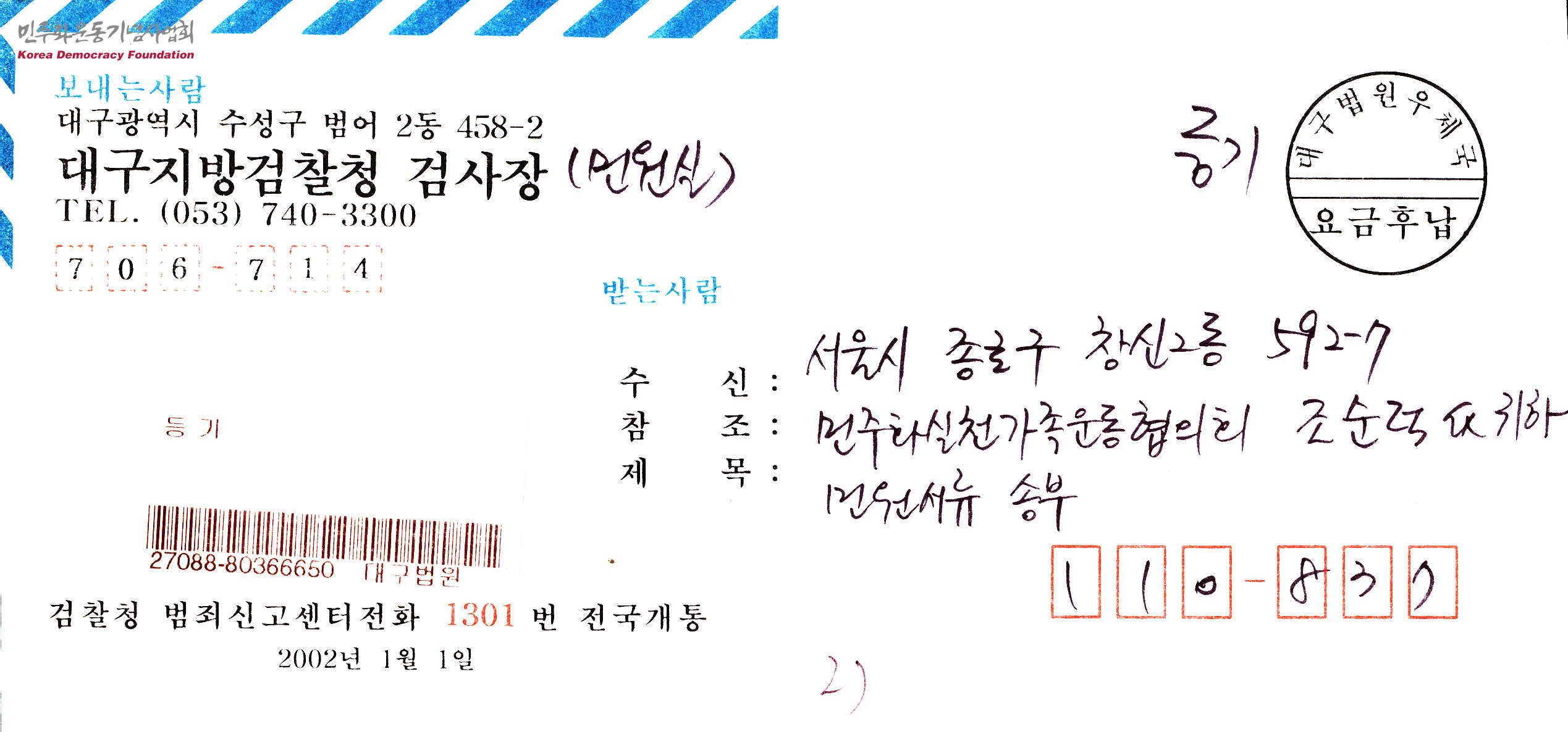 - 대구지방검찰청 민원실에서 민가협에게 보내는 문서로, 김대원에 대한 공주치료감호소 정신감정결과의 정보를 청구했던 건에 대하여 공공기관의정보공개에관한법률제4조제1항 등 3개의 이유로 비공개 결정을 통지하는 내용의 문서