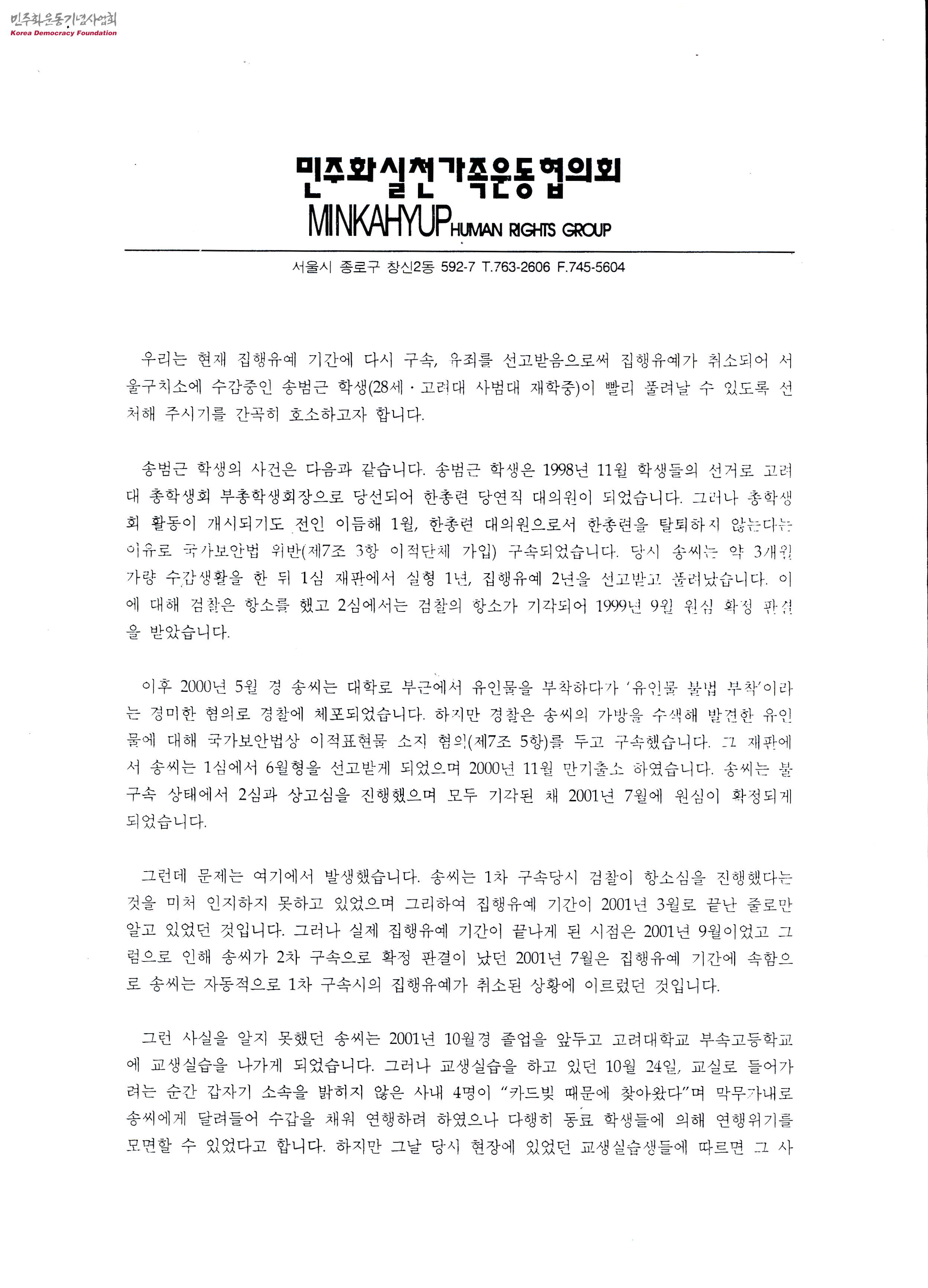 - 서울구치소에 수감 중인 송범근씨와 관련된 선처 호소문으로, 교생실습과 졸업, 임용고시, 군입대 등을 앞두고 있는 송범근씨가 하루빨리 풀려나와 못다한 학업을 마칠 수 있도록 선처를 호소한다는 내용을 담고 있음