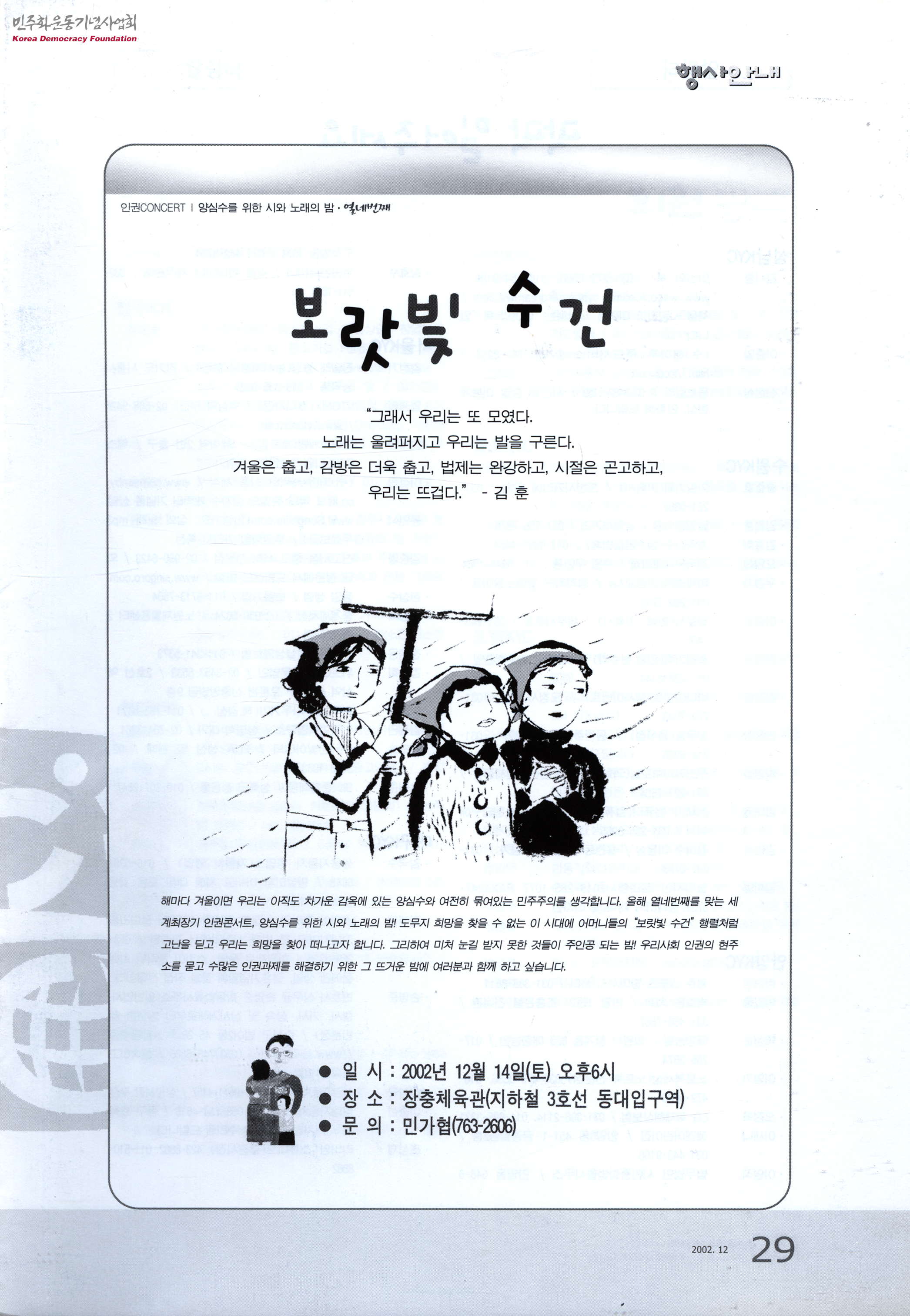 - 『KYC 회원통신』에 수록된 양심수를 위한 시와 노래의 밤 "보랏빛 수건" 관련 문서로, 행사 소개와 일시 및 장소 등의 내용이 담겨 있음
