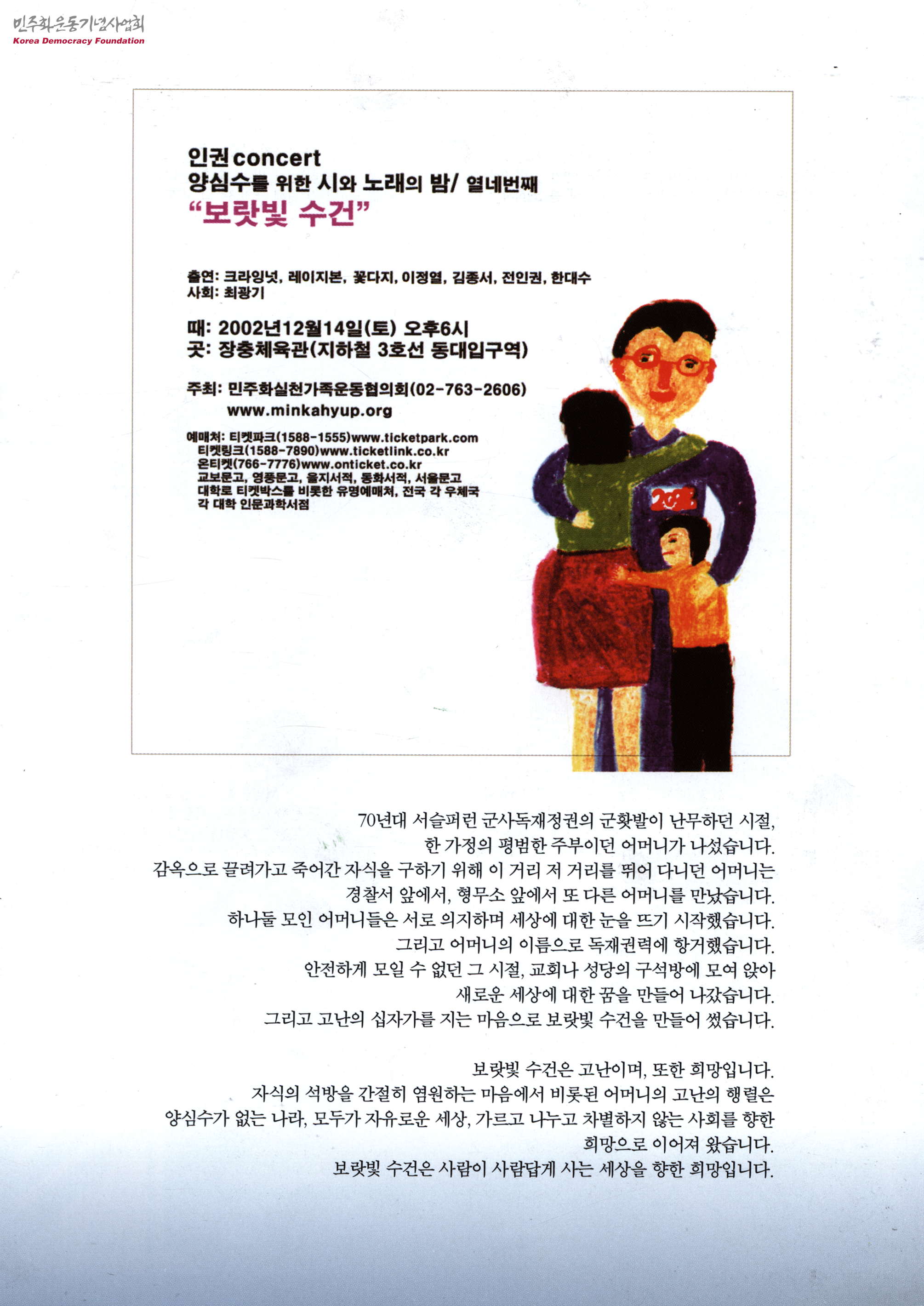 - 민주화운동기념사업회에서 발행한 『희망세상』에 수록된 양심수를 위한 시와 노래의 밤 "보랏빛 수건" 관련 문서로, 출연진 및 사회자 정보, 시간과 장소, 주최자, 예매처 등의 정보와 함께 보랏빛 수건의 의미와 행사의 의의 등의 내용이 담겨 있음