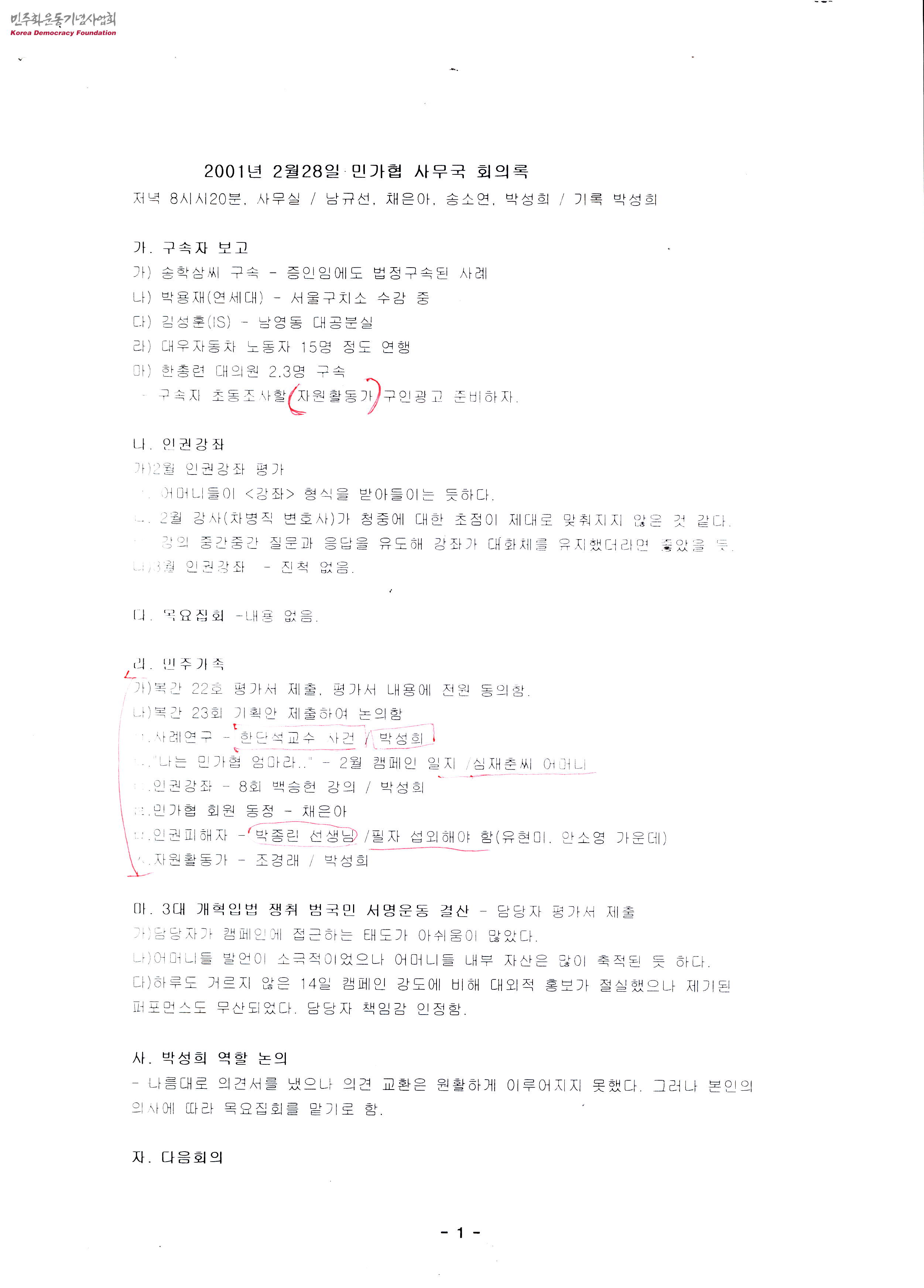 - 2001년 2월 28일 민가협 사무국에서 진행된 회의의 내용이 담긴 회의록으로 구속자 보고와 2월 인권강좌의 평가, 목요집회, 소식지 민주가족의 진행보고, 서명운동의 결산, 박성희의 역할 논의와 다음 회의는 3월 8일에 진행될 예정이고 회의안건으로 구속자 보고와 인권강좌 등의 내용이 논의될 것이라는 내용