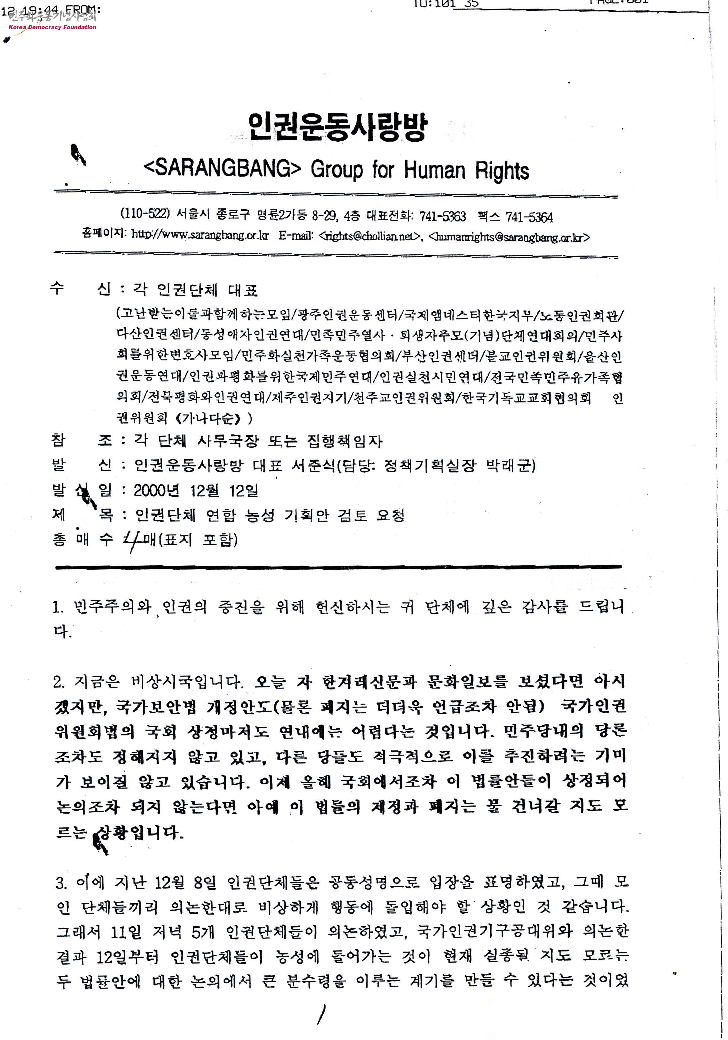 - 인권운동사랑방 대표 서준식씨가 각 인권단체 대표들에게 보낸 인권단체 연합 농성 기획안 검토 요청서로, 현재 국가보안법 개정안도 국가인권위원회법의 국회 상정마저도 안 되고 있는 어려운 상황에서 이러한 문제 의식을 극단적으로 선전할 수 있는 방법은 연합 농성이라 생각하기에 많이 참가해 주시고 부디 끝까지 최선을 다해주길 바란다는 내용 등이 담겨 있는 문서
