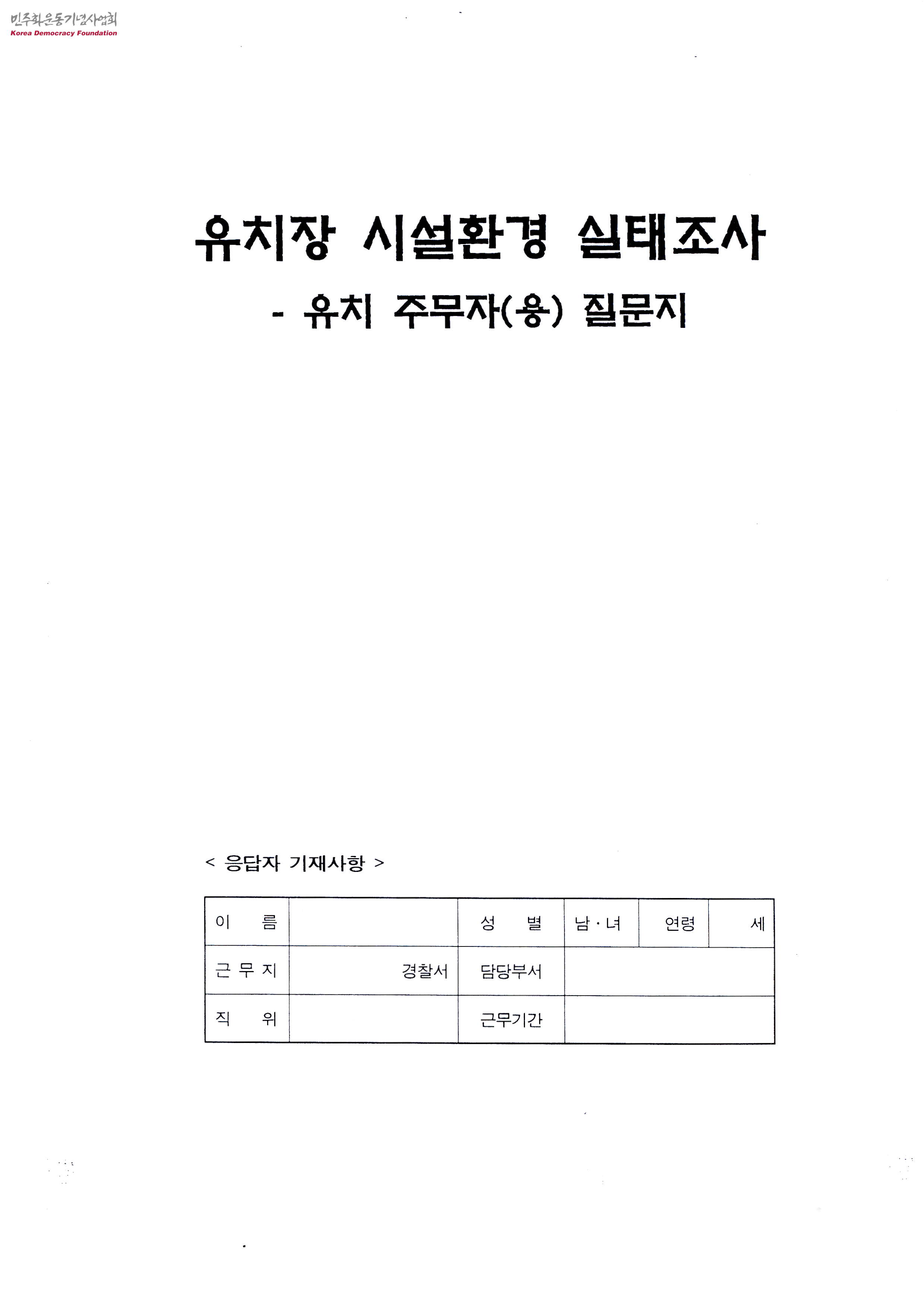 - 유치 주무자용 유치장 시설환경 실태조사 질문지로, 폐쇄회로, 관급물품 목록, 주·부식, 면회·접견, 고지 및 게시, 의료, 규율 및 계구의 사용, 신체검사, 유치인 보호관, 권리구제 방법, 외국인 입감자를 위한 통역관 유무, 여성유치인·장애인·노약자·20세 미만·외국인 등의 1년 평균 입감인원 항목의 질문 목록이 담겨 있음