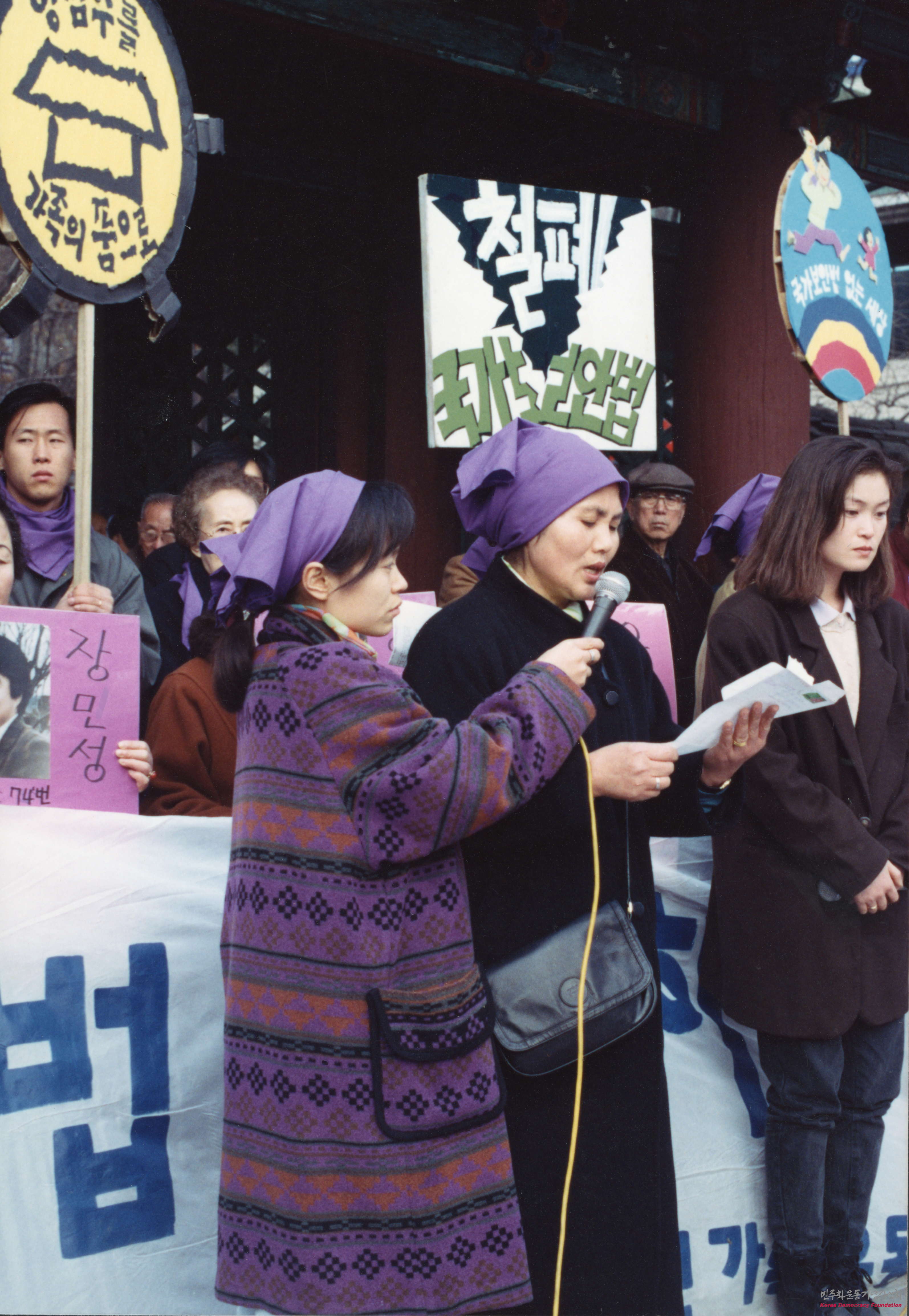- 국가보안법으로 구속된 양심수들을 위한 목요집회로 국가보안법 철폐와 양심수 석방을 요구하는 내용이며, 한 여성이 이와 관련하여 연설하고 있는 모습이 담긴 사진