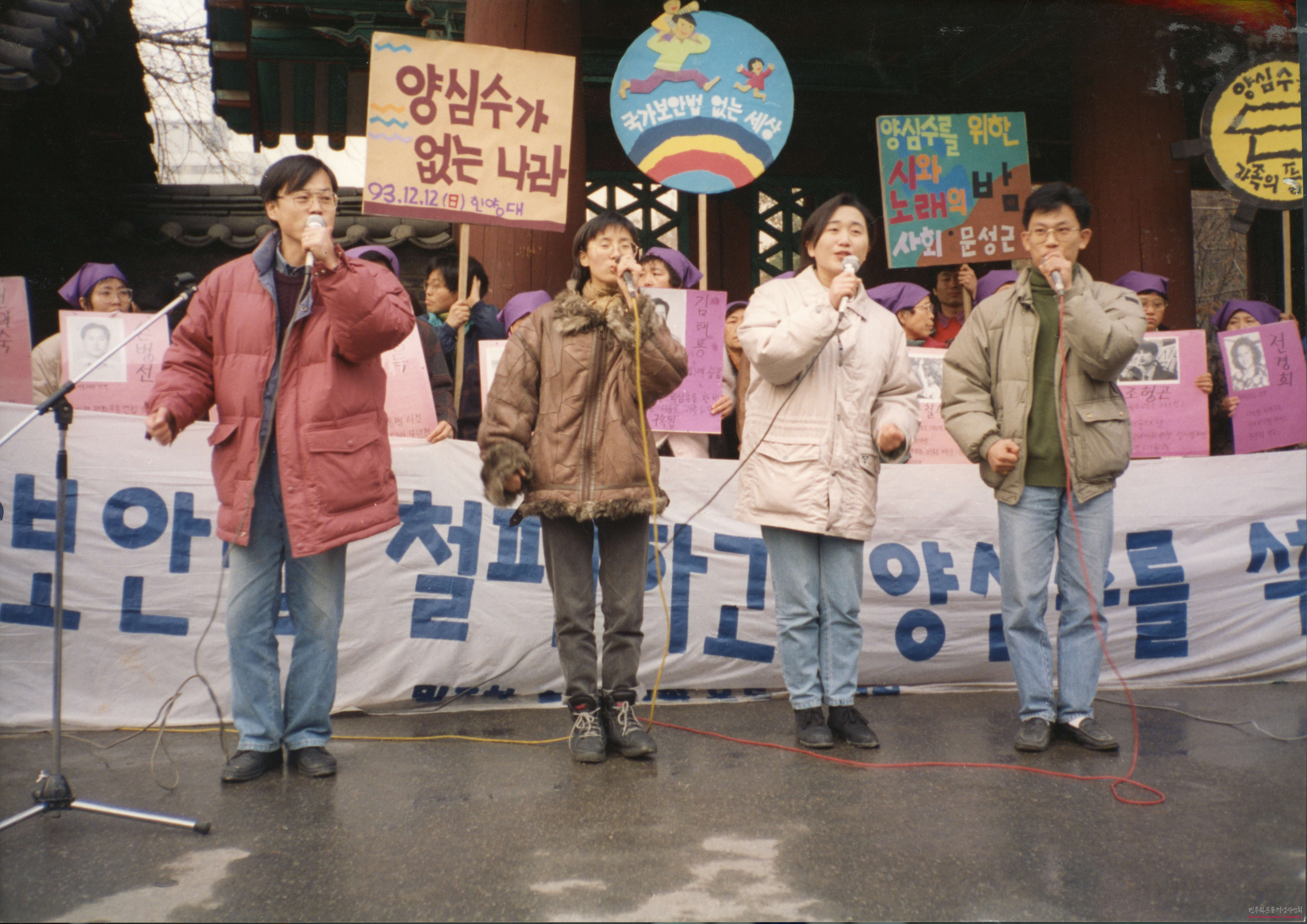 - 양심수를 위한 시와 노래의 밤 야외 공연 사진으로, 이 공연은 1993년 12월 12일 한양대학교 올림픽 체육관에서 진행되었으며 야외에서 노래를 부르는 사람들의 모습이 담겨 있음