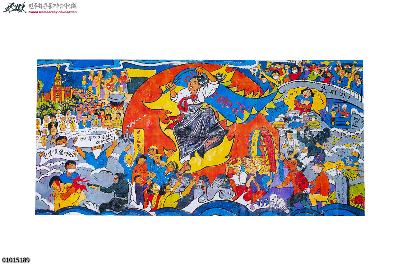 - 1987년 6월항쟁의 승리를 기리고 민주화 투쟁의 의지를 하나로 묶기 위해 한국여성단체연합(여성연합)은 1987년 7월 8일~11일 기간 동안 명동성당에서 민주시민대동제를 개최하였다. 당시 민족미술인협회(민미협) 산하 여성미술분과 회원 김인순, 윤석남, 김종례, 구선희, 정정엽, 최경숙은 시민들과 함께 걸개그림을 공동제작하였는데 이 그림은 당시의 걸개그림을 추후 전시용 판넬로 다시 제작한 것이다