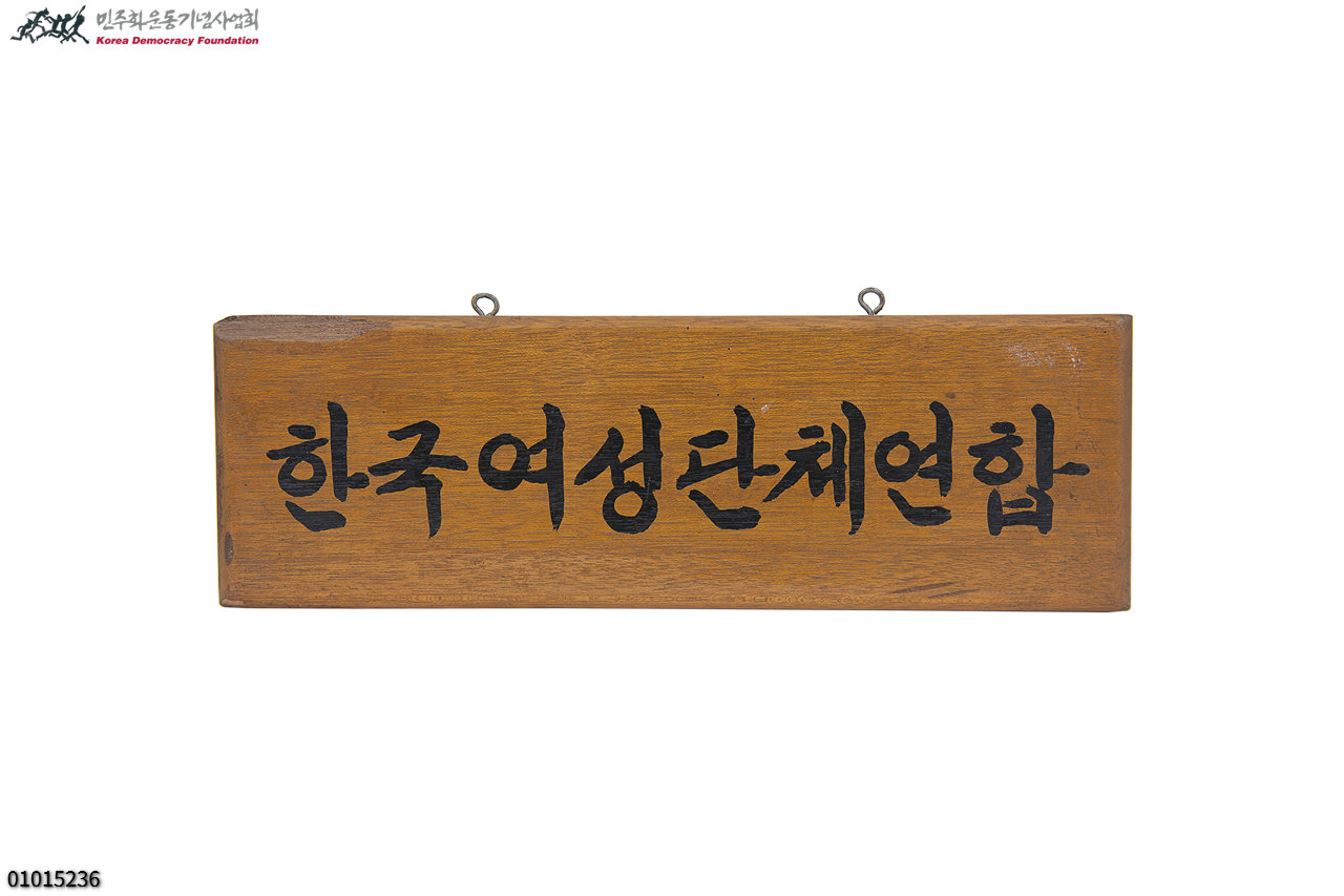 - 한국여성단체연합이라고 쓰여진 나무 현판으로 상단에 현판을 거는 고리가 2개 있음