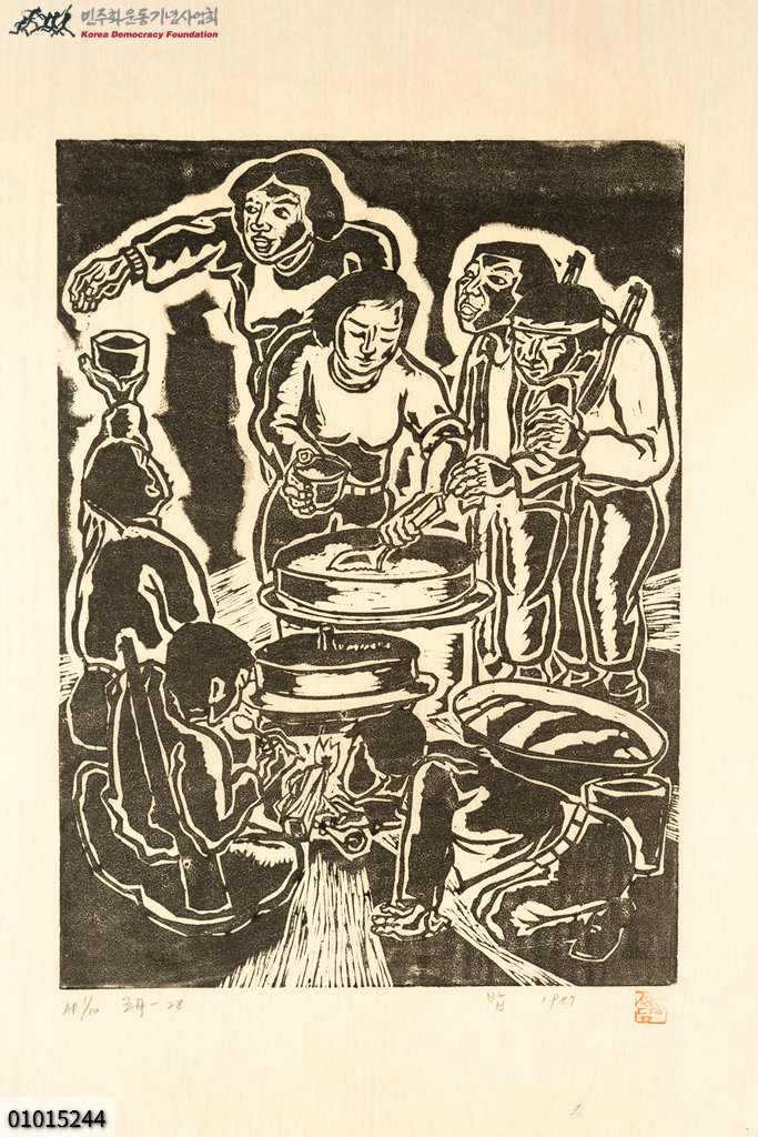 - 홍성담의 판화 작품 「밥」으로 하단에 좌측에 AP 1/10 五月-28 라는 글씨가 있고 우측에는 낙관이 찍혀 있음