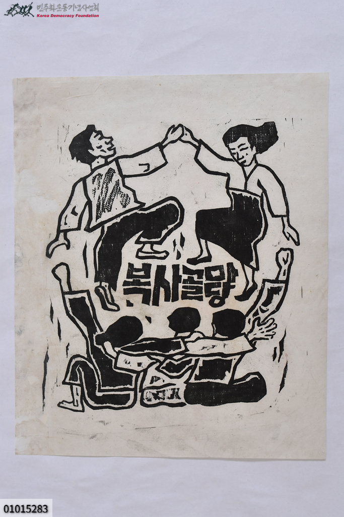 - 김봉준의 판화작품 복사골마당. 중앙에 복사골마당이라는 글씨가 있고 주변으로 사람들이 춤을 추거나 응원하고 있음