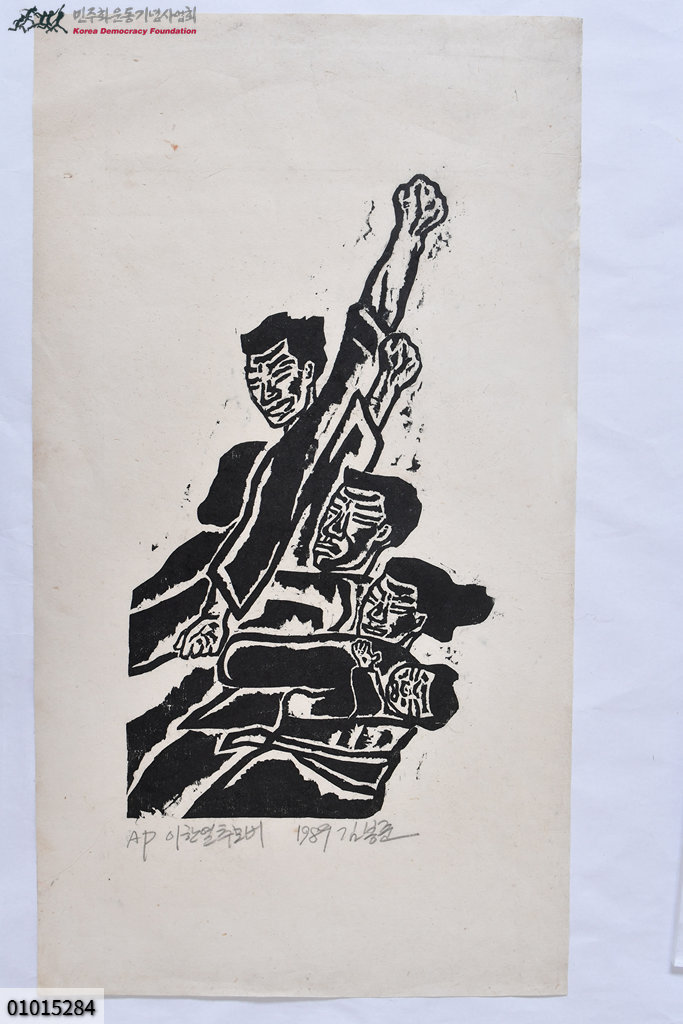 - 김봉준의 판화 작품 이한열 추모비. 네명의 사람이 앞뒤로 껴안으면서 앞의 사람은 손을 뻗고 있음
