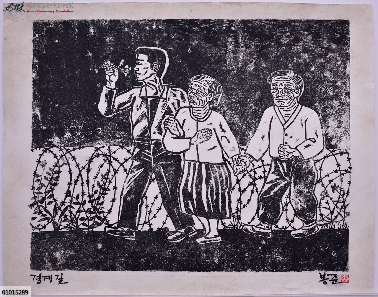 - 김봉준의 판화 작품 경계길. 윤형철조망 옆을 세 사람이 걸어가고 있음