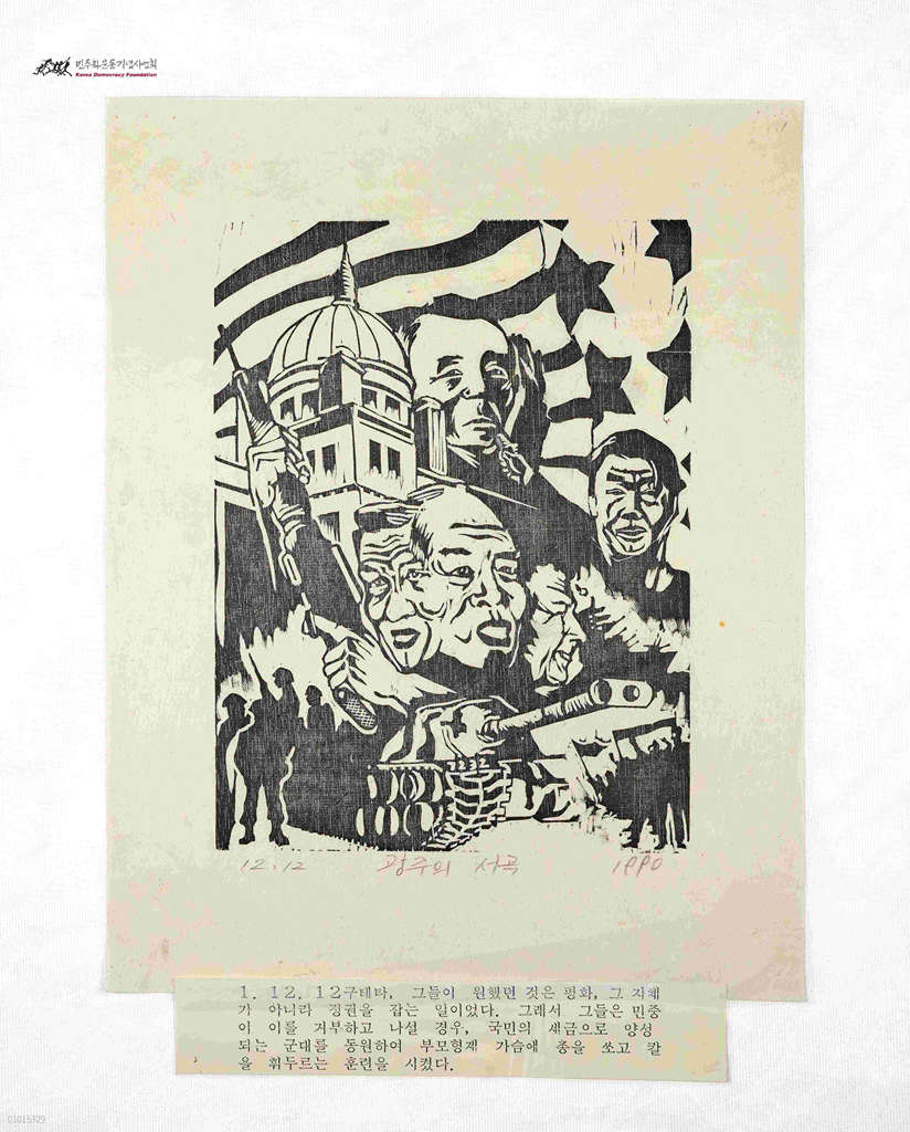 - 12.12 쿠데타 관련 인물들의 얼굴과 탱크, 군인들의 모습 묘사