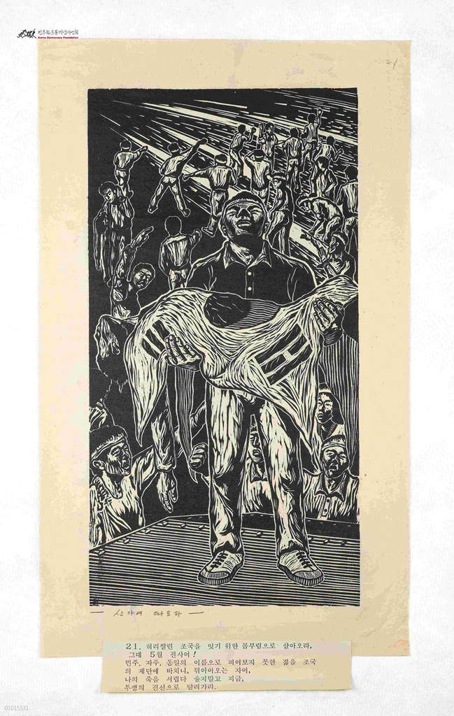 - 태극기가 덮힌 사람을 안고 서있는 남성 뒤로 투쟁하는 사람들의 모습 묘사