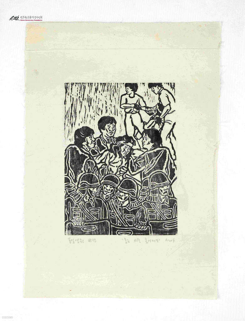 - 시위대를 막고있는 군경과 여자를 연행하는 3명의 남자들, 그 뒤로 팔다리가 잡힌 채 연행되는 사람 그림
