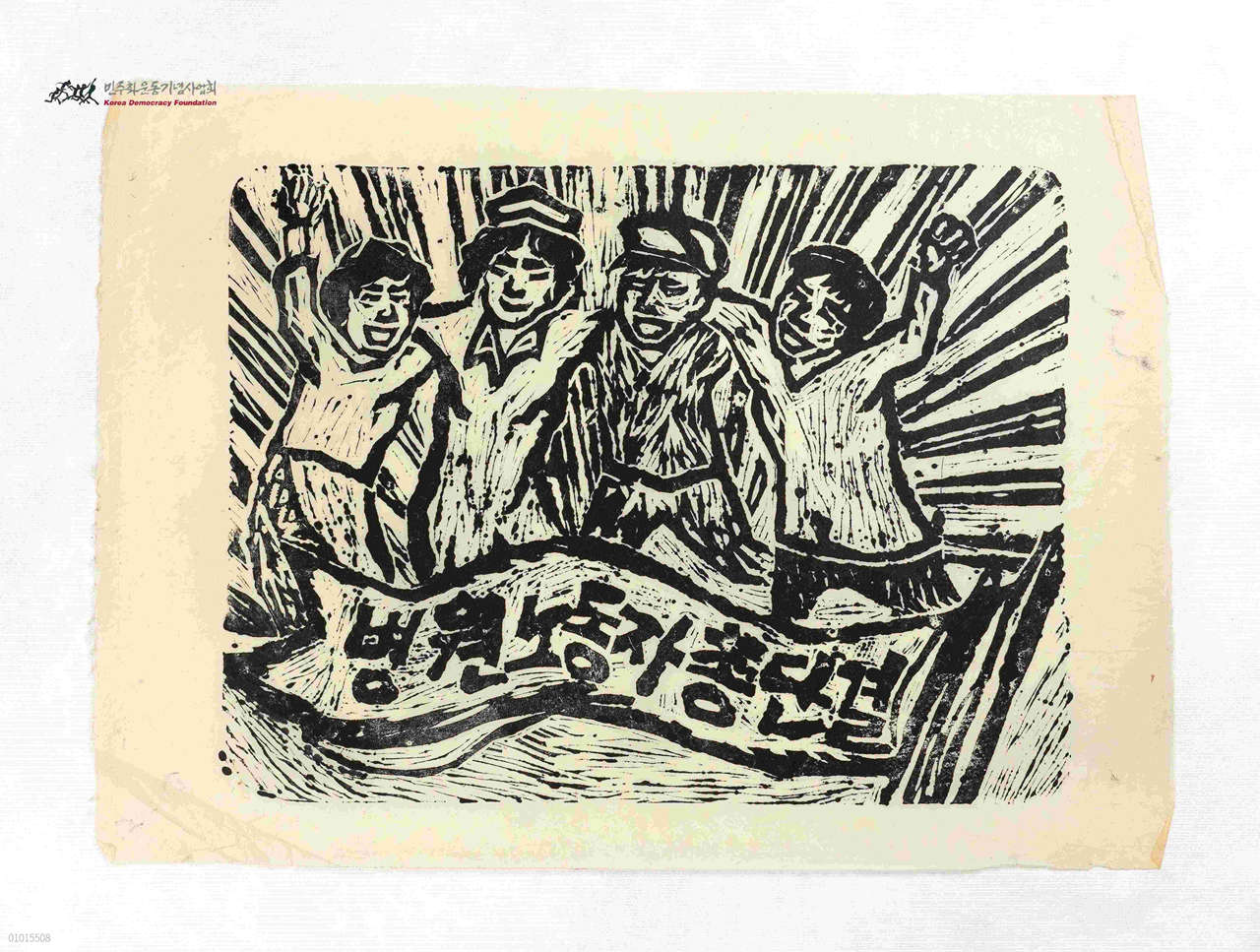 - 병원노동자 총단결' 깃발과 그 위로 어깨동무하고 있는 사람 4명 그림