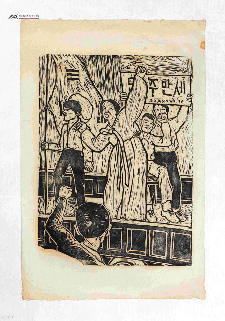 - 트럭에 탄 채 태극기를 들고 행진하는 시위대 그림