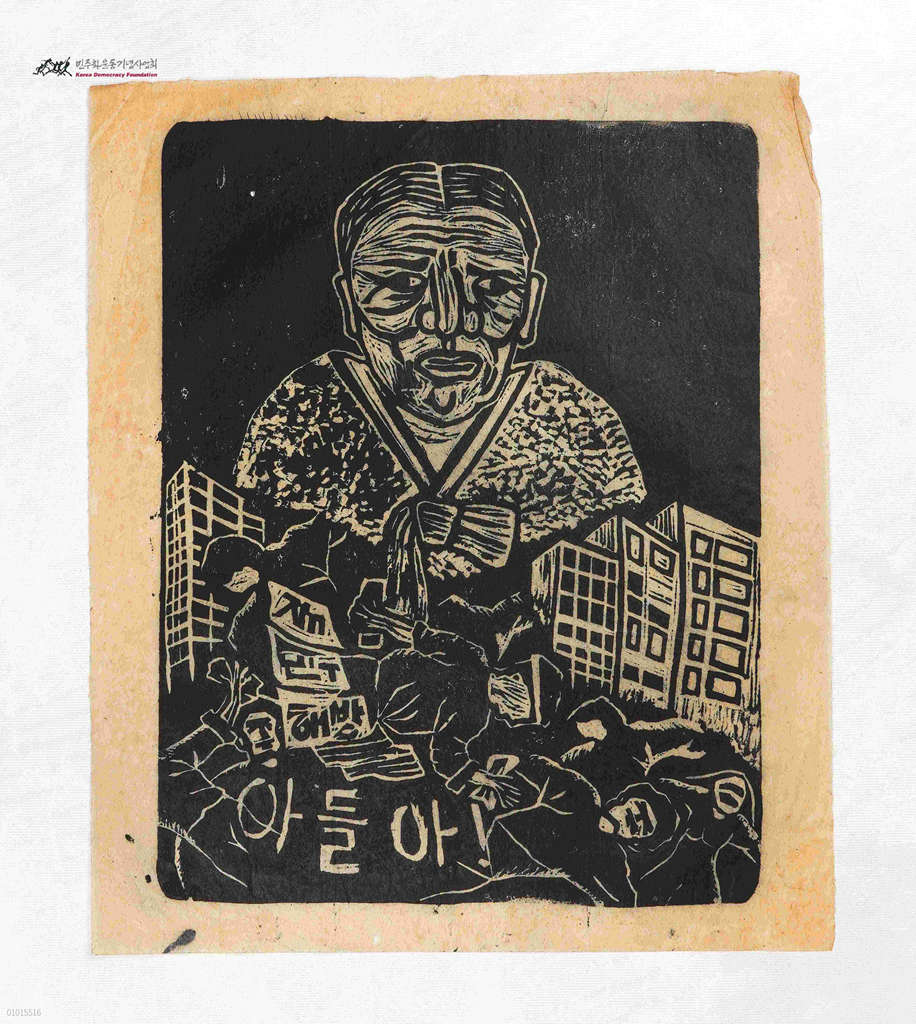 - 어머니 그림을 배경으로 쓰러진 시위대의 모습 그림
