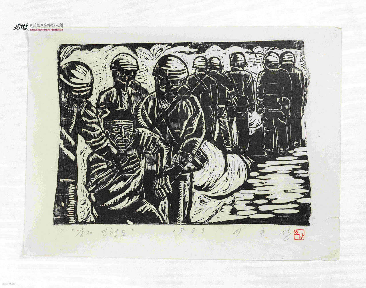 - 군경에 의해 강제로 연행되는 남자와 시위대를 막고있는 군경들의 그림