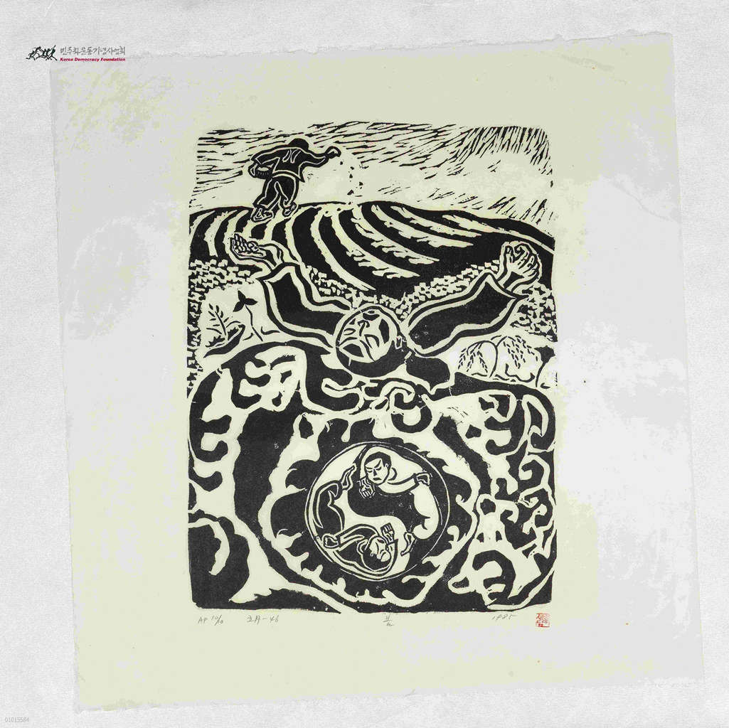 - 씨를 뿌리고 있는 농부와 그 아래 두 팔 벌리고 하늘을 바라보는 한 여성