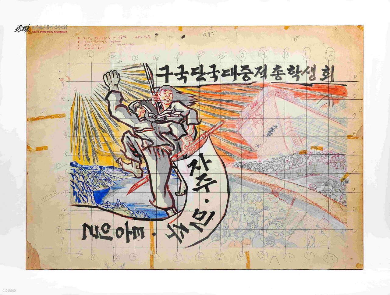 - 자주.민주.통일이 적힌 깃발을 들고 있는 사람들
