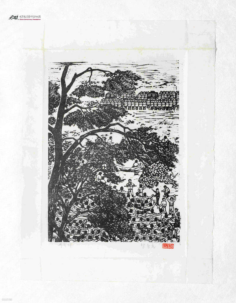 - 군경 앞에서 시위하는 시위대와 소나무에 대한 그림