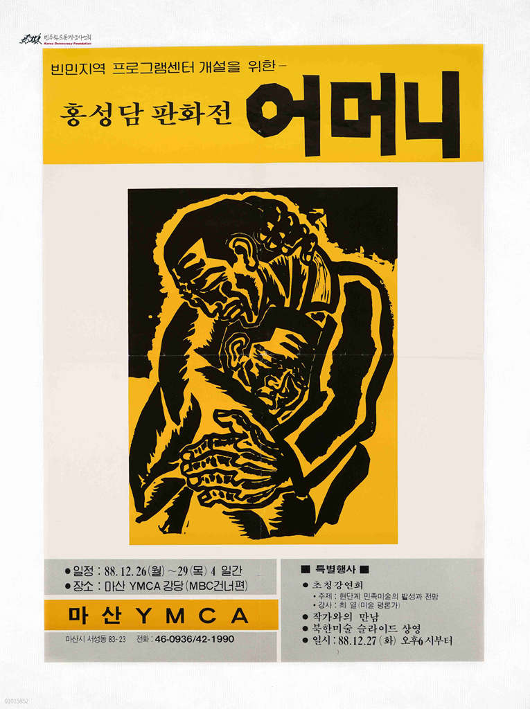- 1988년 마산에서 열린 홍성담 판화전 홍보 포스터로, 부둥켜 안고 있는 모자 간의 모습을 담고 있음
