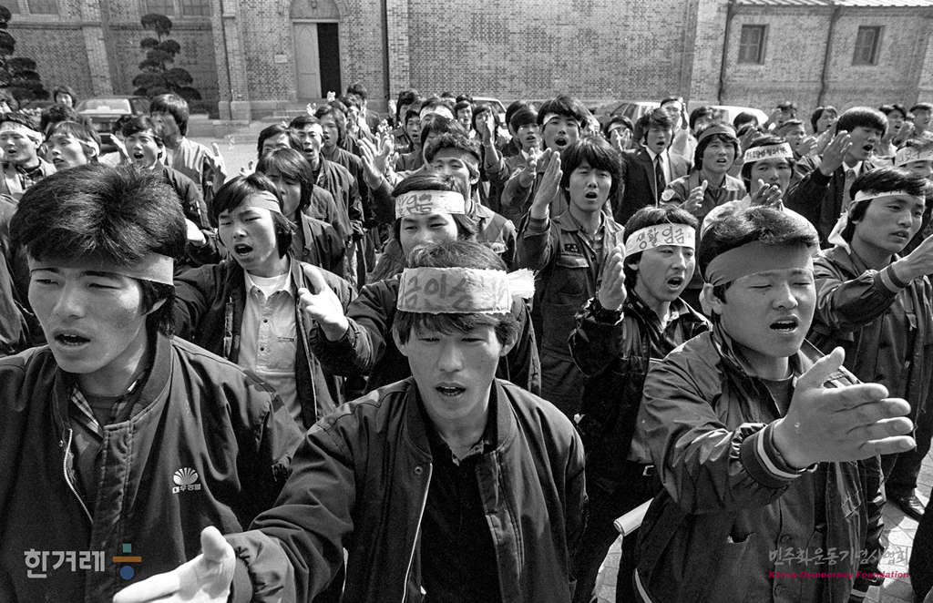 - 1988년 4월 23일 기본급인상 등을 요구하며 12일째 서울 명동성당에서 농성을 벌여온 대우정밀 양산노동자 150여명은 노조간부에 대한 구속취하 귀사즉시 협상재개 등 4개항에 합의한 귀 농성을 풀기로 하고 경남 양산 공장으로 돌아가는 버스에 오르기 전 구호를 외치며 결의를 다지고 있다.