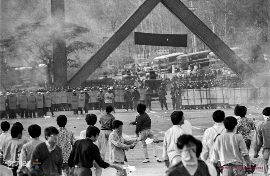 - 1988년 4월 28일 오후1시 서울대 연세대 고려대 등 서울시내 10여개대 대학생 1천 5백여명이 서울대 아크로폴리스광장에서 지난 86년 전방입소반대시위당시 분신자살한 서울대생 김세진 이재호열사의 2주기 추도식을 갖는 뒤 교문밖진출을 시도하다 저지하는 경찰에 맞서 시위를 벌이고 있다.