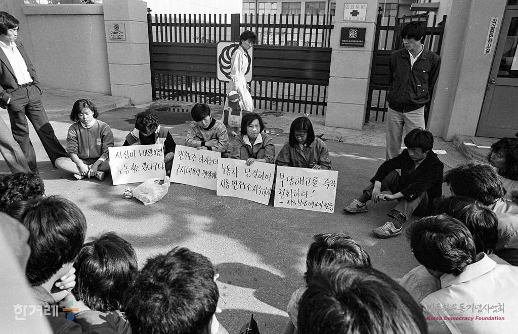 - 1988년 5월 10일 서울 영등포구 양평동 서통디스플레이테크 정문앞에서 해고노동자와 지지자들이 부당해고 철회를 요구하며 농성을 하고 있다. 회사는 노조설립에 반대해 회사를 노조를 무력화하고 회사측 노조를 만들어 새 집행부를 인정하지 않은 이들을 해고해 버렸다.