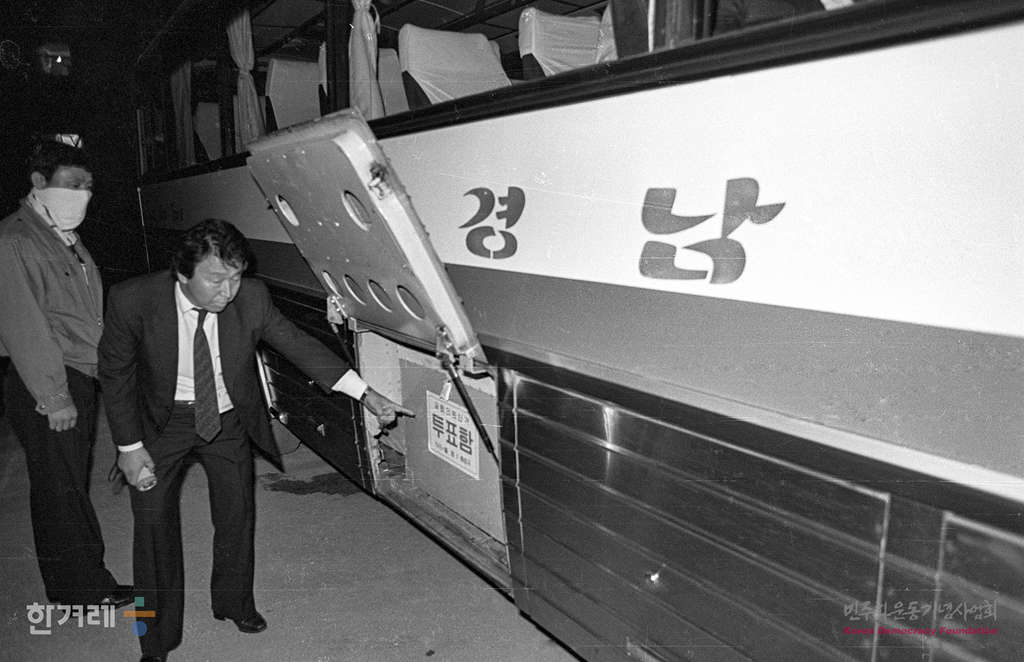 - 1988년 4월 26일 전국적으로 제 13대 국회의원선거가 실시된 가운데 서울 구로을구 개표장인 구로 부녀복지회관에서 민주당 참관인들이 민정당의 릴레이식투표를 문제삼아 투표함을 개표장 안으로 운반하지 못하도록 저지하고 있다.