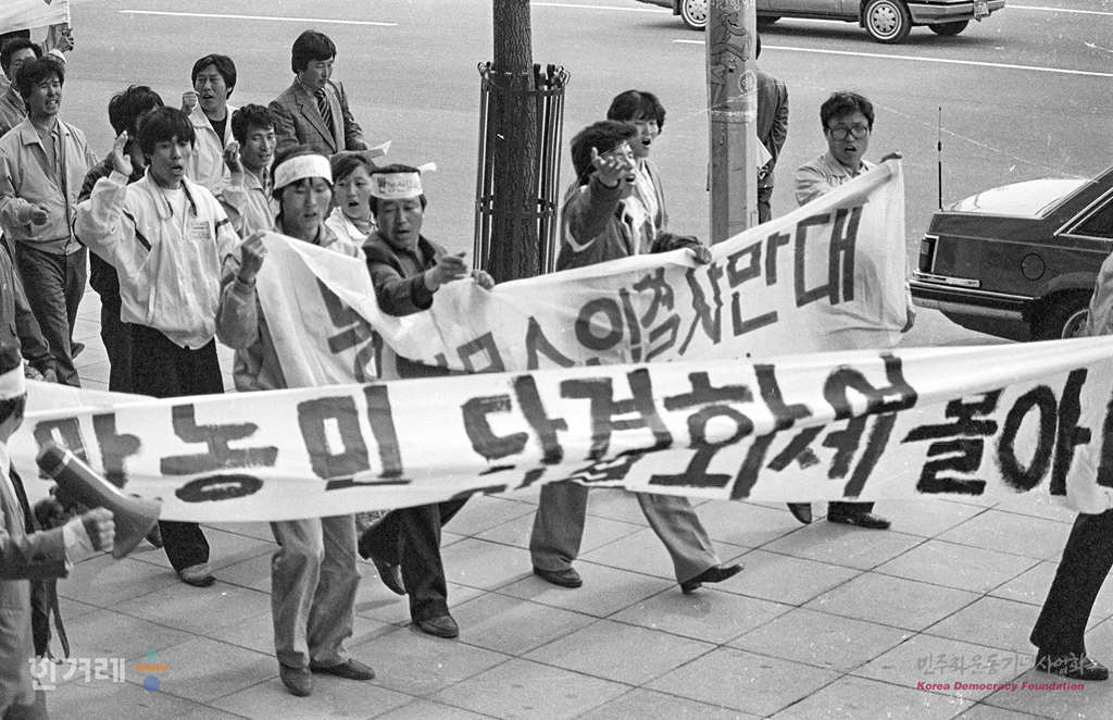 - 1988년 4월 22일 농 축산물 수입저지를 위한 전국농민대회가 서울 화양동 건국대학교에서 열려 전국에서 온 농민들과 학생들이 집회를 갖고 있다.