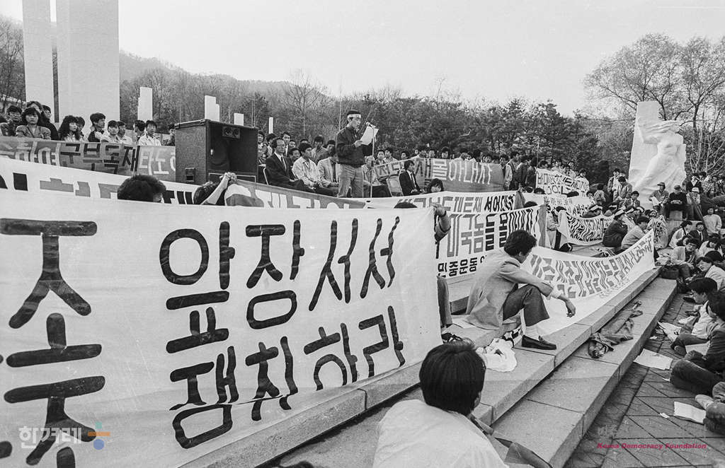 - 1988년 4월 19일 4.19의거 28주년을 맞는 서울 수유리 4.19묘역에서 서울지역 청년학생운동연합이 주최하는 88구국항쟁선언식과 반민정당 총선투쟁민주연합이 주최하는 4월혁명 28주년 기념 및 반군부독재투쟁선언대회가 연이어 열리고 있다.