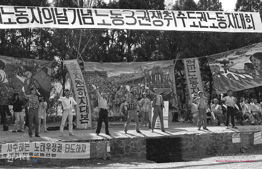 - 1988년 5울 1일 서울시내 대학생과 재야노동단체회원 및 노동자 6천여명이 참석한 가운데 서울 연세대 노천극장에서 서계노동자의 날 기념 노동 3권 쟁취 수도권노동자대회를 갖고 있다.