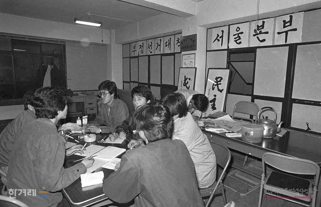 - 1988년 4월 26일 17년만에 소선거구제로 실시되는 13대 총선이 온각 불법 타락 폭력이 난무한 가운데 부정선거대책 서울본부 회원들이 상황을 살피고 있다.